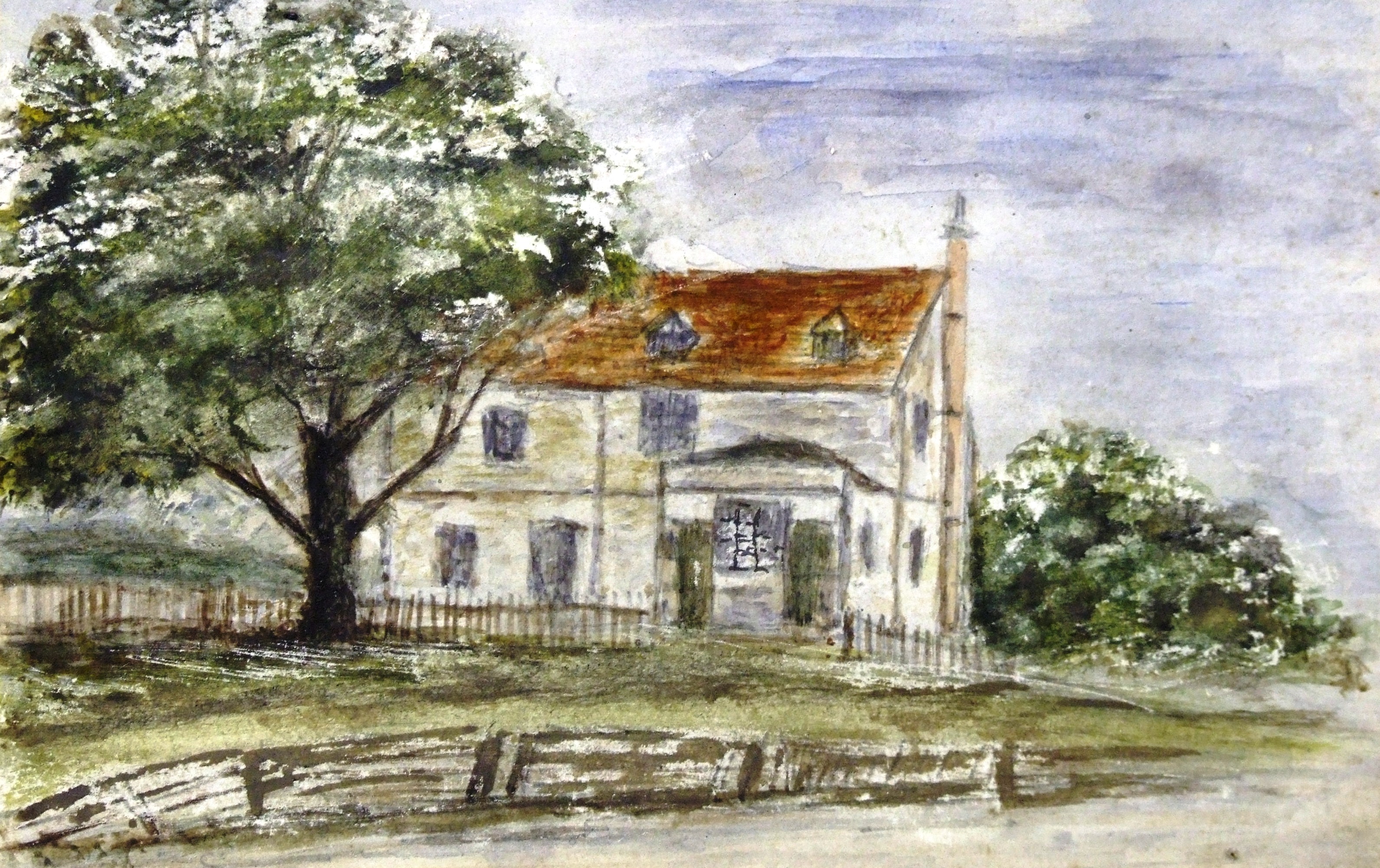 Watercolour sketch; small quite crude amateur sketch showing the old Coach & Horses Inn, Watling St, Strood. In an album of 210 sketches. Artist known as 'C' (or possibly 'C.F.N.), a Cliffe resident. Sketches were painted between 1864-1911; 1860's/70's of some Surrey/London locations, 1880's/90's Medway & Hoo peninsula; added later pencil comments by artist.