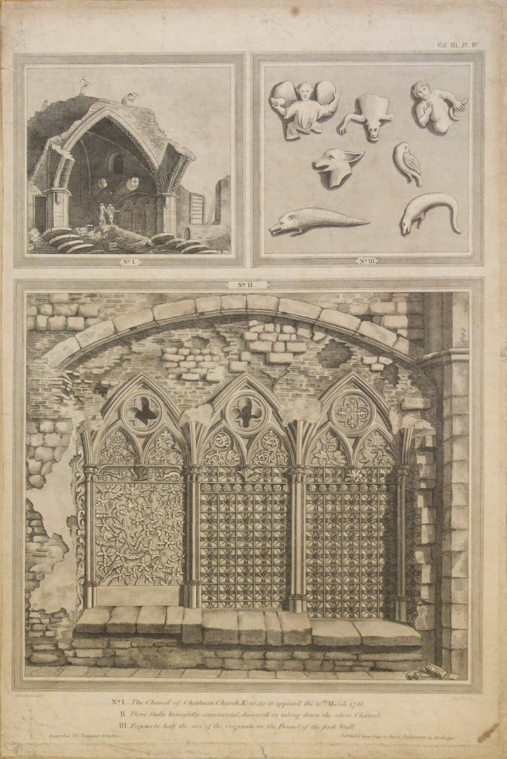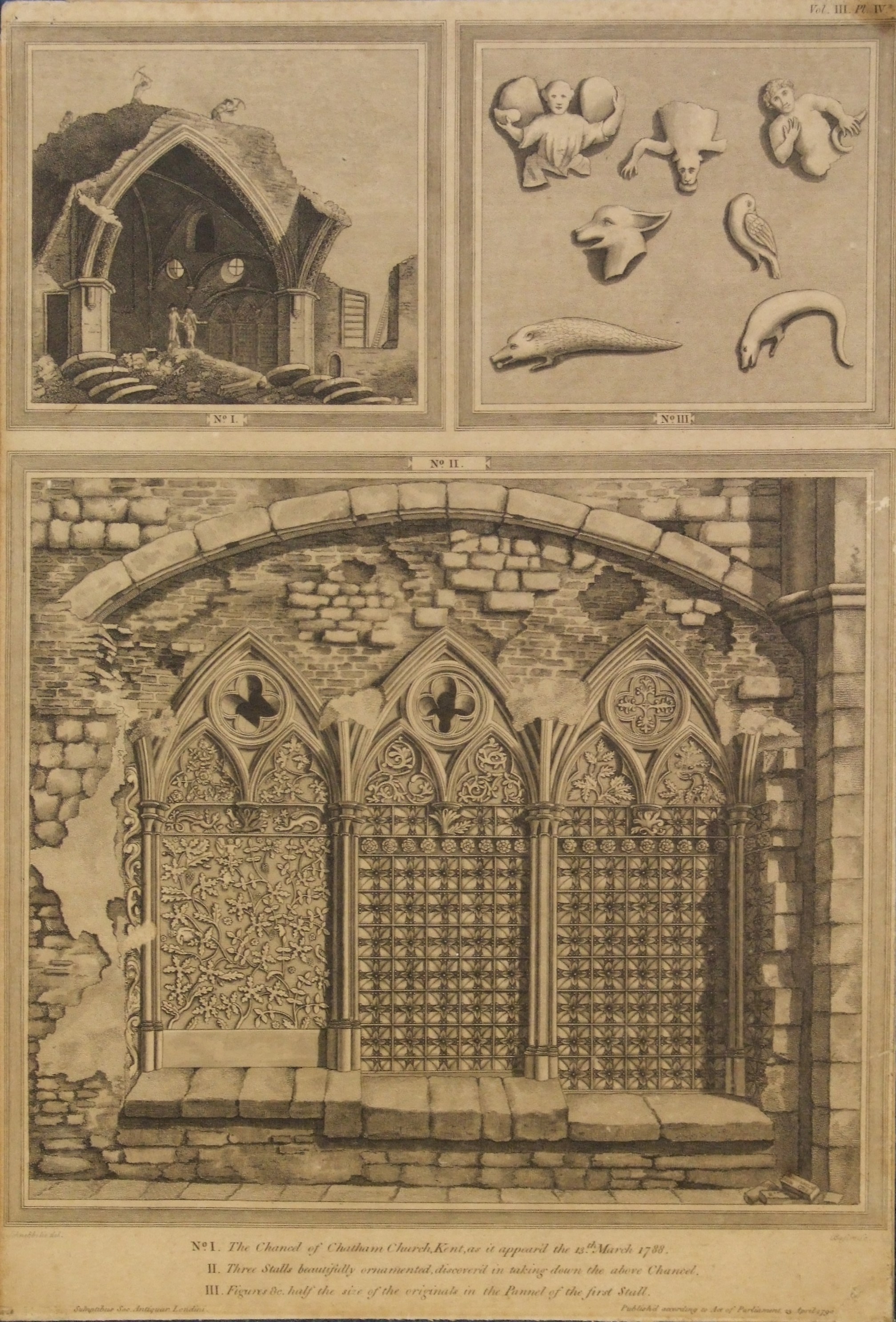 Engraving of 3 images of details of the medieval interior of Chatham Church, taken from a large book; 1. view of the vaulted chancel being demolished; 2. three ornamental stalls; 3. figure details from stalls. 2 copies, both mounted on old card; produced during a period of sustantial rebuilding of the church. For related text see A5061 & A6905.