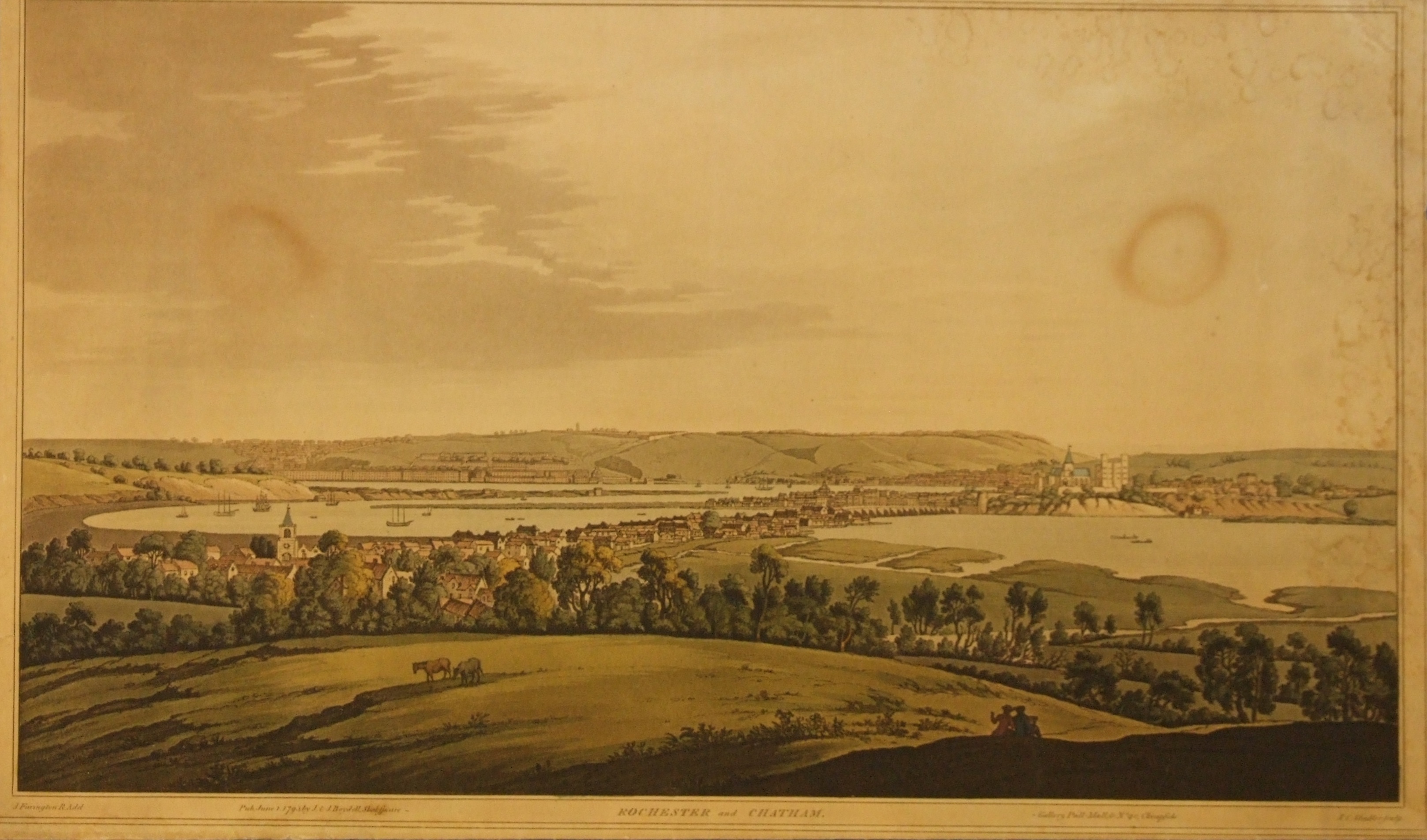 - DescriptionPrint of a view of the River Medway from Strood hill, showing Strood & Rochester with Chatham in the background; lightly tinted with colour (aquatint).