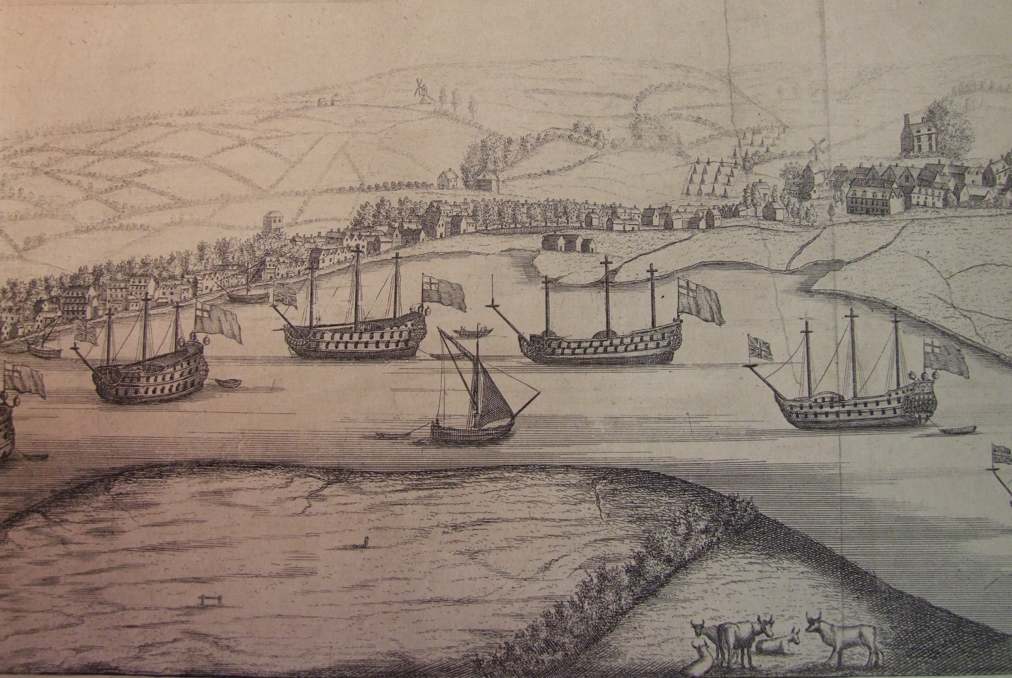 Engraving of a panoramic view of Rochester & Chatham Docks, presented to 2 sections, one above the other; viewed from Frindsbury windmill; details of the city's main buildings, Chatham dockyard; the ships are Navy vessels that have been 'laid up in ordinary', meaning that they have been stripped of their guns and most of the rigging apart from the lower masts. These were ships that were held in 'reserve', they could either be recommissioned in the event of a war, broken up for scrap, or 'hulked' (converted into store, hospital or prison ships).