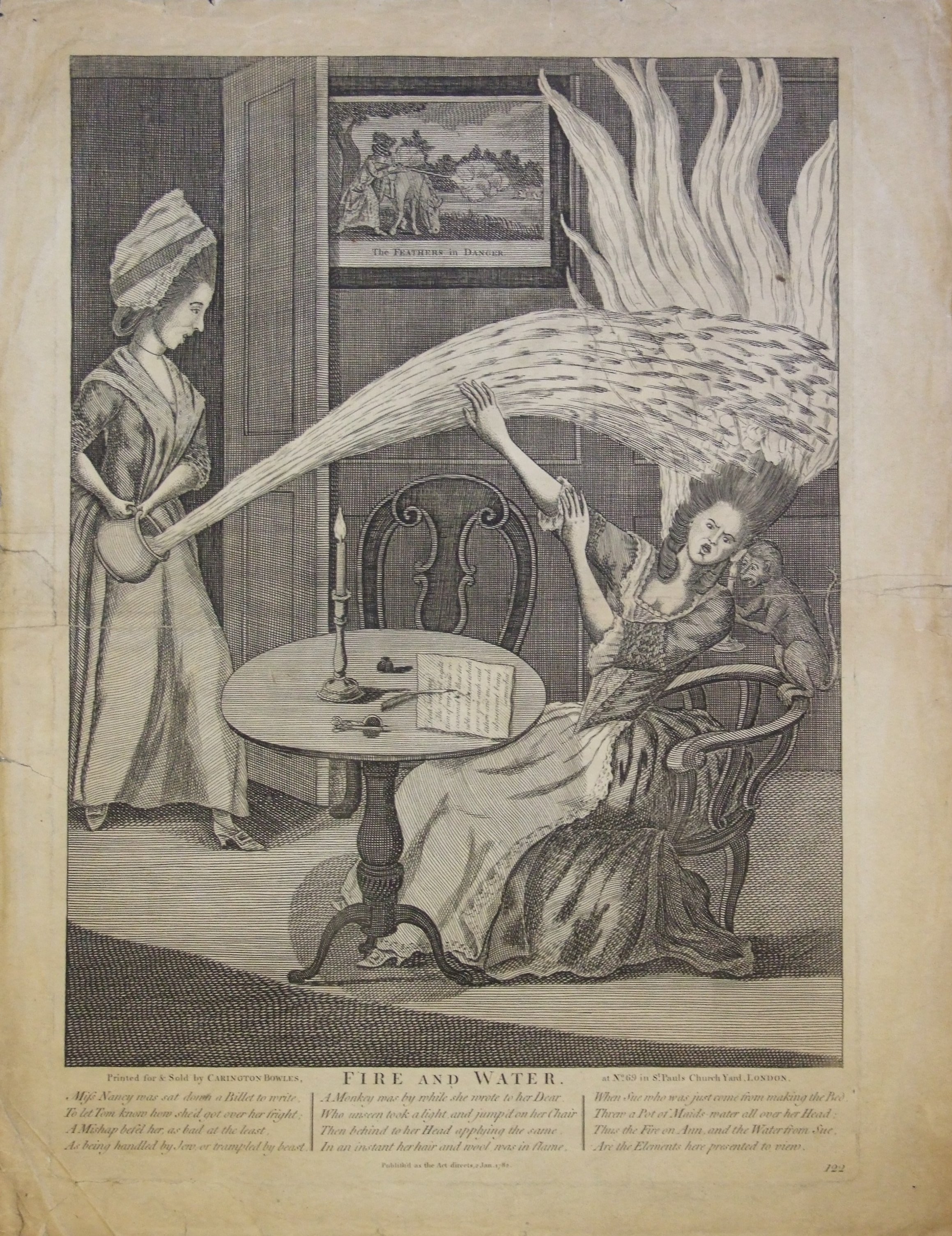 - Descriptionephemera; engraving of the ballad sheet 'Fire & Water'; shows comic scene of a lady's hair being set on fire by a monkey & extinguished with the contents of a chamber pot. Published 2 Jan, 1782.