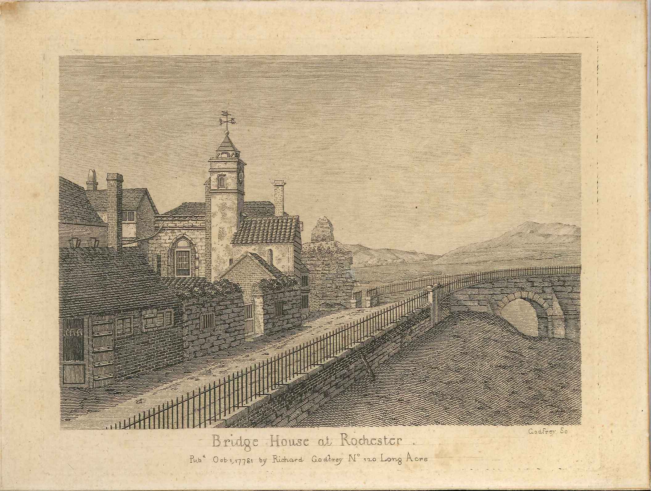 - DescriptionEngraved print of a view of the Bridge House at Rochester; whilst details of the building may be correct, the background is not, showing very little of the castle & a rather steep valley for the Medway! Numerical error in the date beneath the image; glazed & framed. Although not marked with number, assumed to be E84.