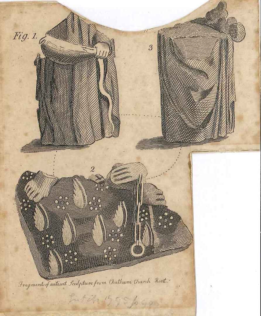 - DescriptionEngraved print of three views of 2 fragments of a carved statue from old Chatham church, showing a draped lower torso, and a base with carved feet & chain. Cut out of the 'Gentleman's Magazine', 1795, Part II, Vol LXV, page 905.