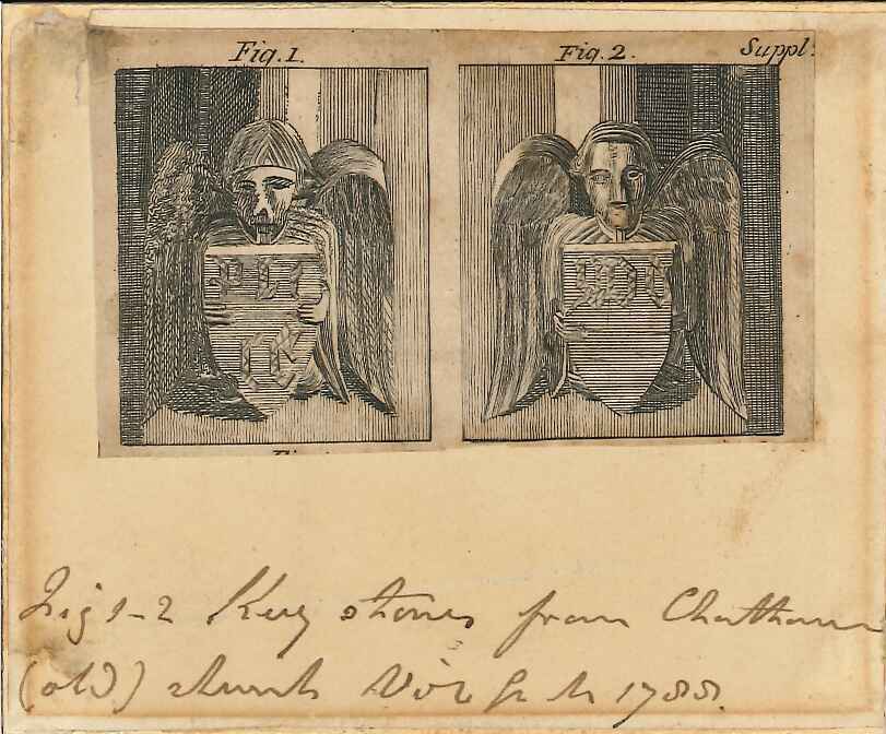 - DescriptionEngraved print (small) of two small carved architectural features in Chatham old church; 2 winged angels? holding shields with lettering (the second of which seems to say 'God') Picture taken from a book or magazine and mounted on card; possibly dates from the 1788 rebuild period.