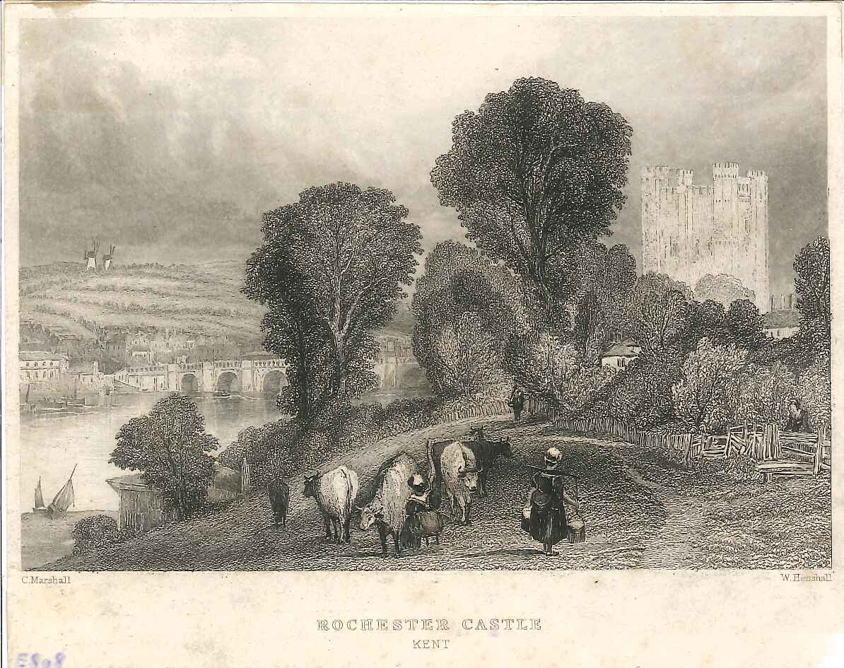 - DescriptionEngraved print of Rochester castle; based on a picture by C Marshall, engraved by W Henshall; shows castle from the south, bridge & Strood in the background, 2 windmills on the horizon; foreground has cows & milkmaids. Part of the text has been trimmed away: 'London, Simpkin, Marshall & Co. C.Tilt & the Proprietors, 1, Cloudesley Terrace, Islington.'