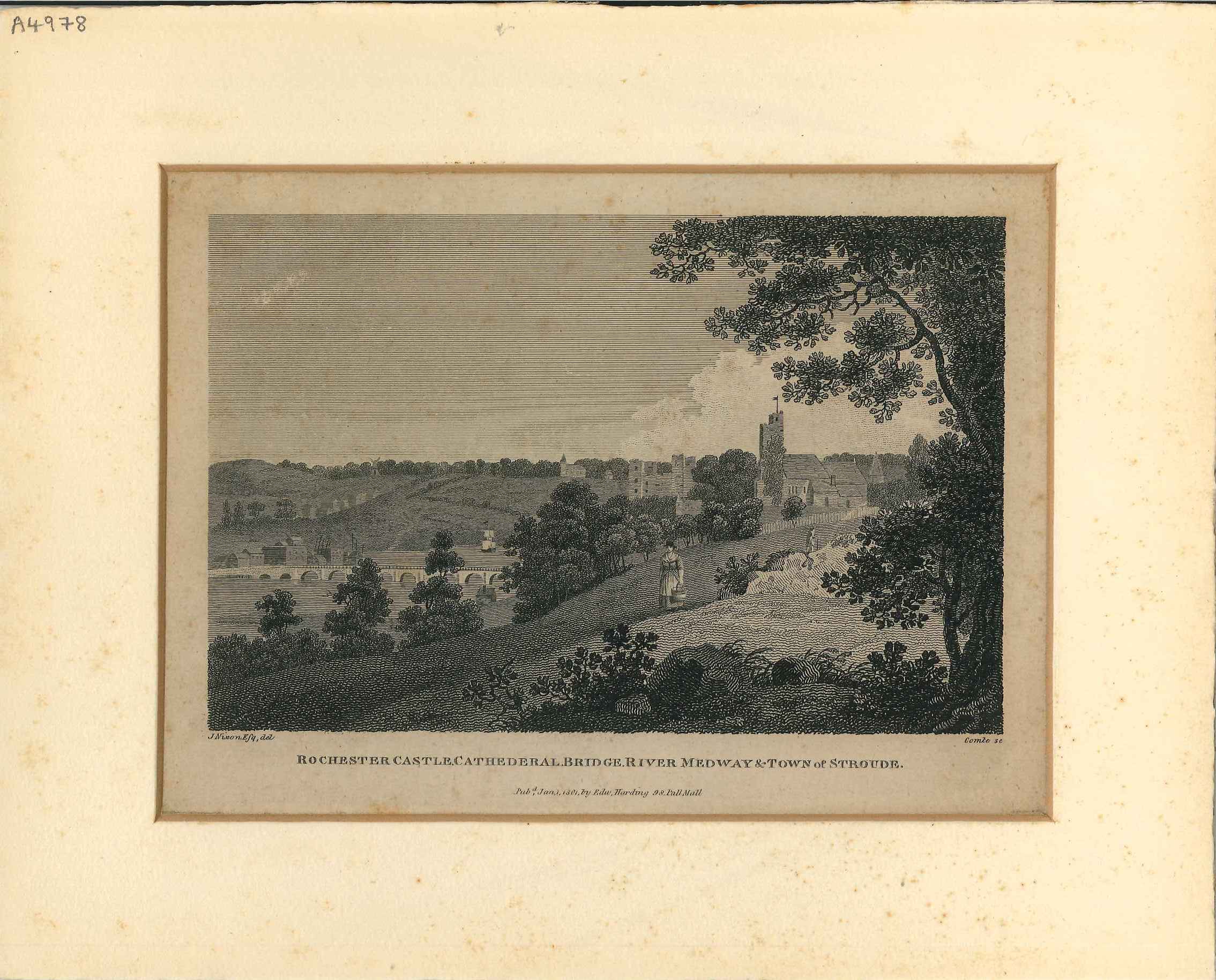 - DescriptionEngraved print of a view of Rochester from the south (backfields); shows St Margaret's Church, distant castle keep & Rochester Bridge; milkmaid in the foreground.