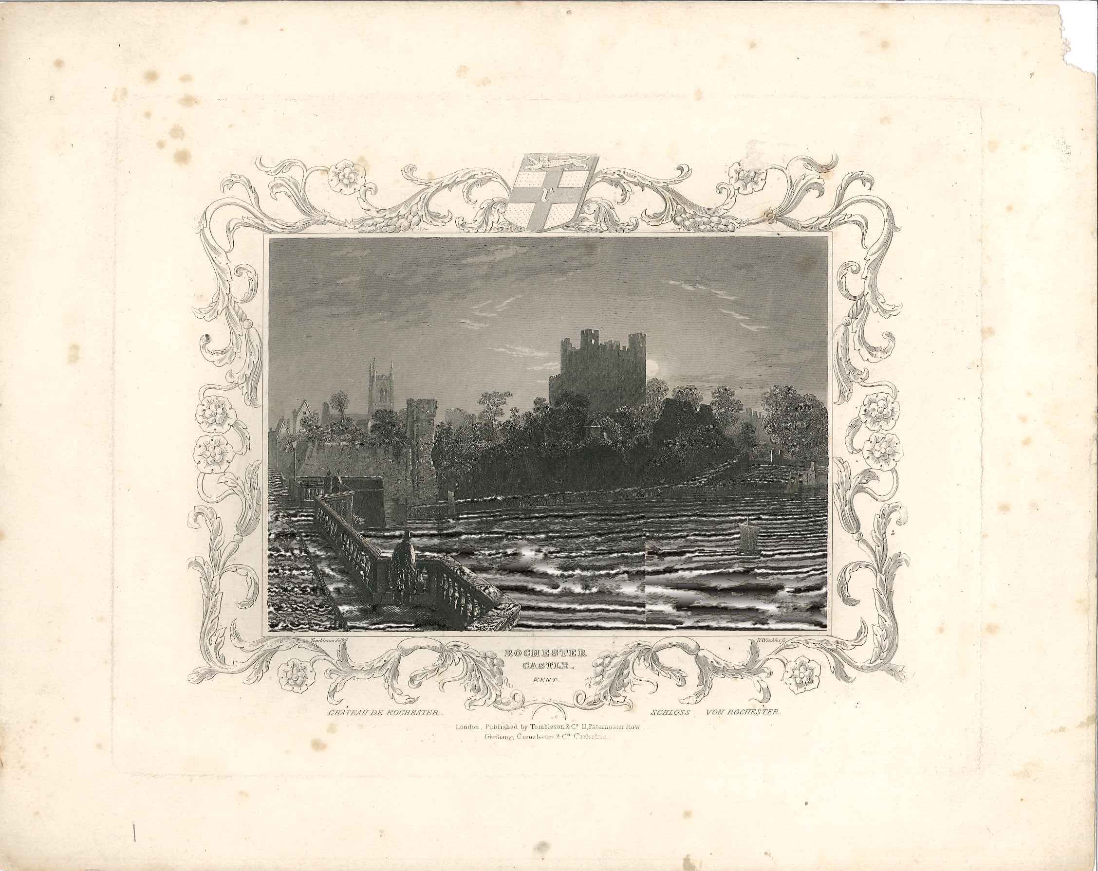 - DescriptionPrint of a view of Rochester castle from the bridge, by moonlight; cathedral beyond; figures on bridge in the foreground; from 'Views of the Thames & Medway' (1833-34); decorative printed border. Taken from Tombleson's 'Views of the Thames & Medway', a part-work published 1833-1834.