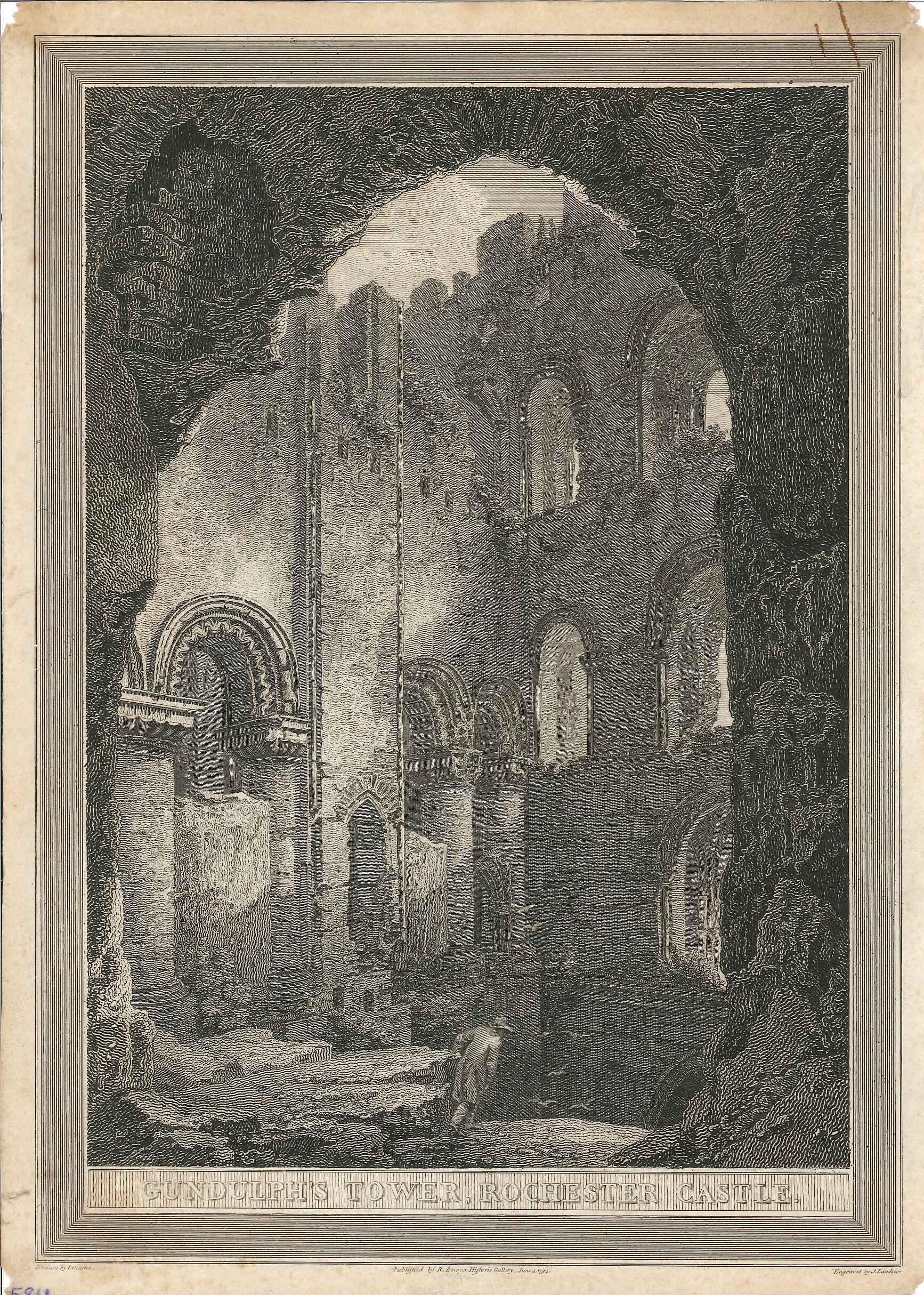 - DescriptionPrint of a view of the interior of Rochester castle keep; shows internal arches & arcading, quite overgrown in places; elderly gentleman in long coat in foreground; presumably from a book.