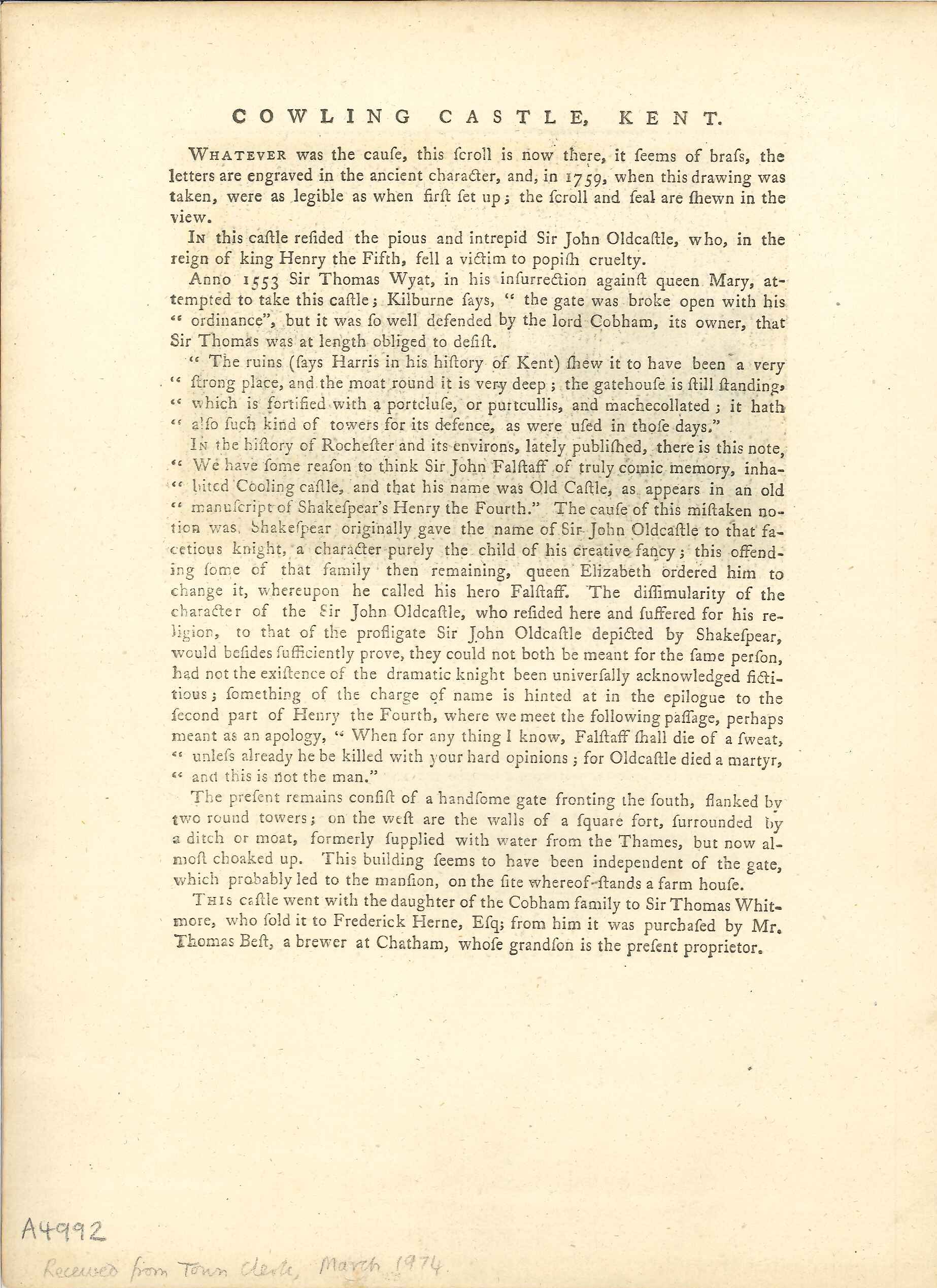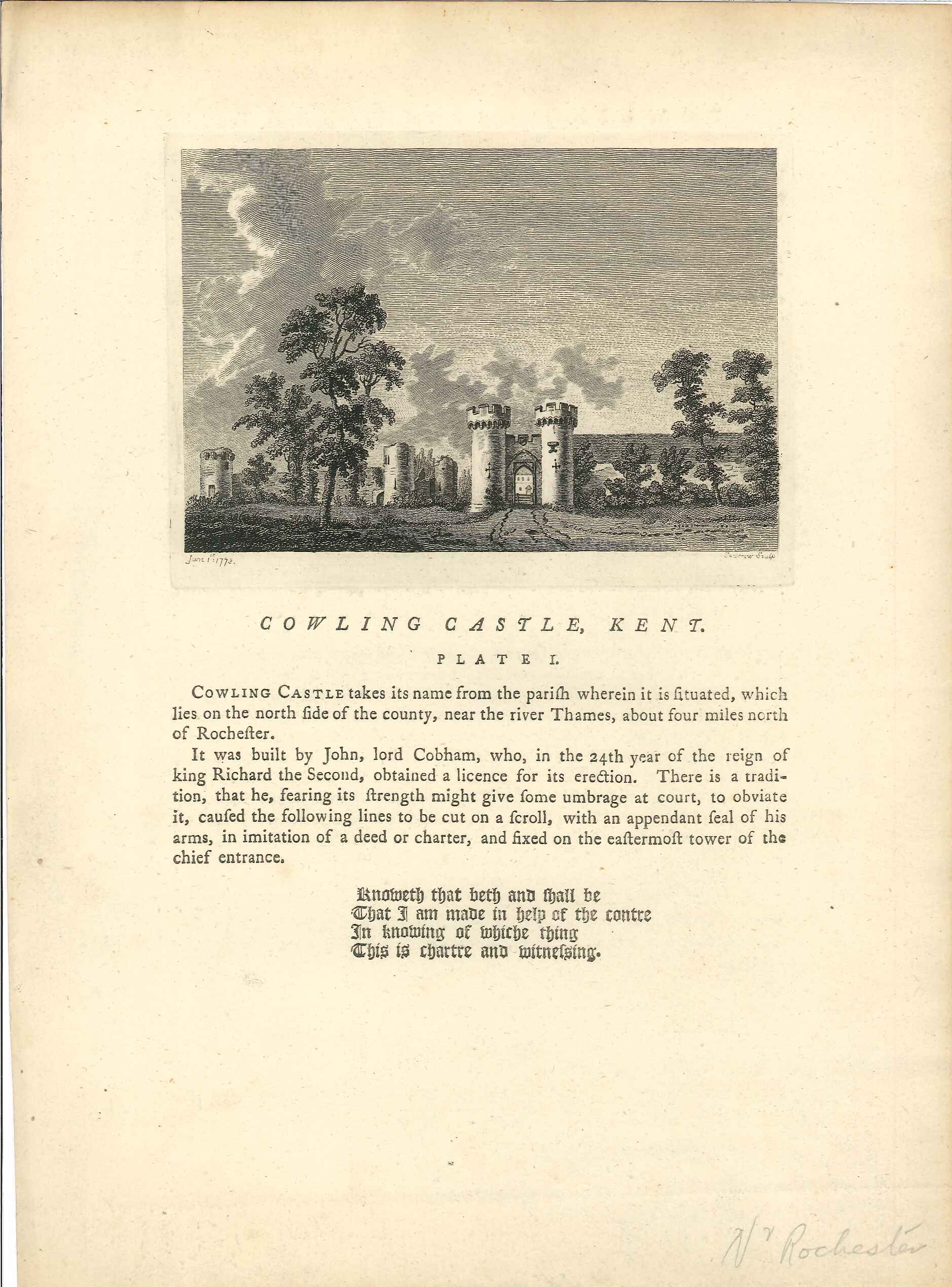 - DescriptionEngraved print of Cooling castle; shows gatehouse & part of curtain walls with towers; taken from a book, with accompanying history text below & overleaf, image being 'Plate I' (see A4993 for 'Plate II' from the same book). This and A4993 are removed from the same book.