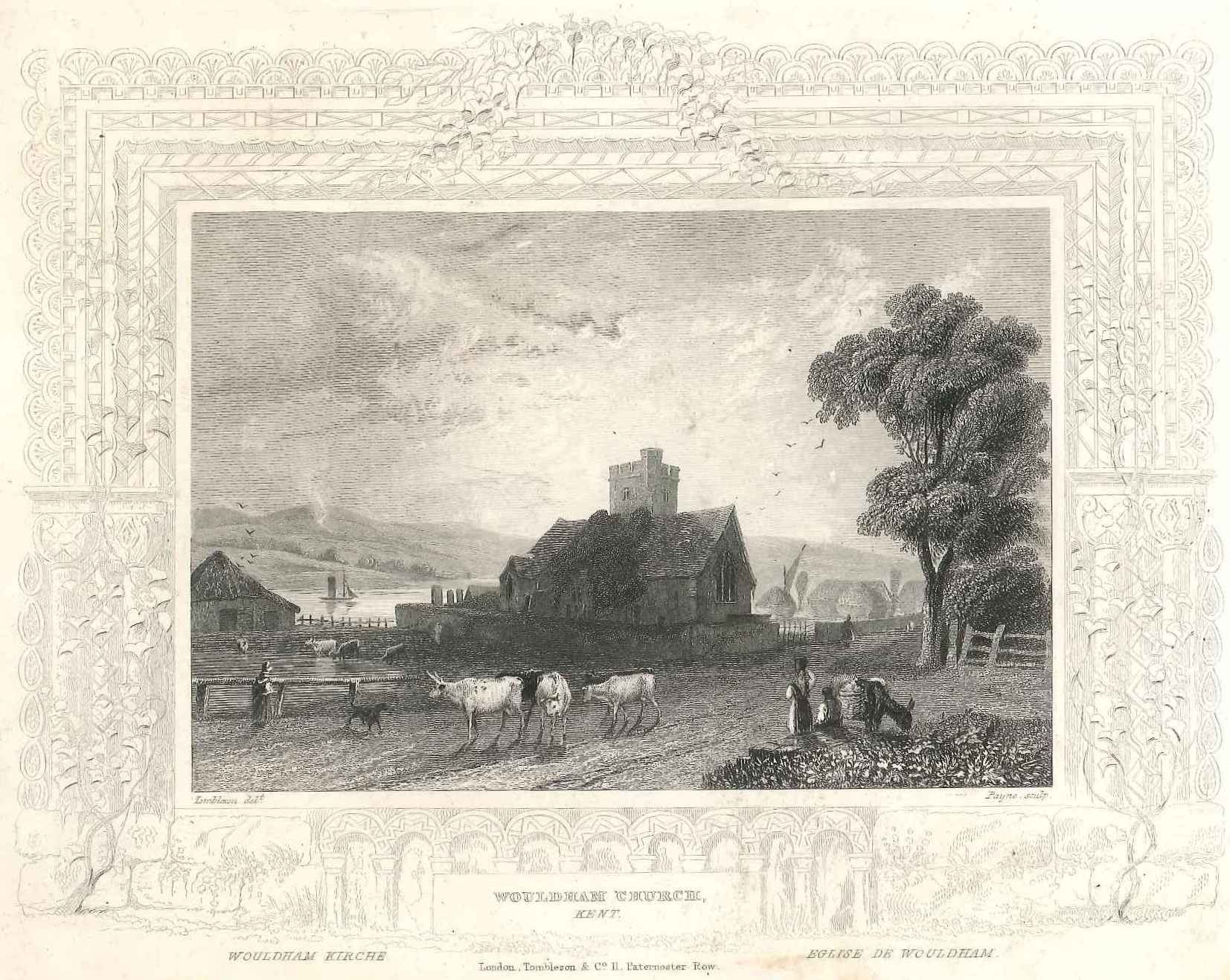 - DescriptionPrint of a view of Wouldham church, the Medway beyond; in the foreground are cattle & rustic folk; from 'Views of the Thames & Medway' (1833-34); decorative printed border. Taken from Tombleson's 'Views of the Thames & Medway', a part-work published 1833-1834. Not marked, but assumed to be E119 on the Payne inventory.