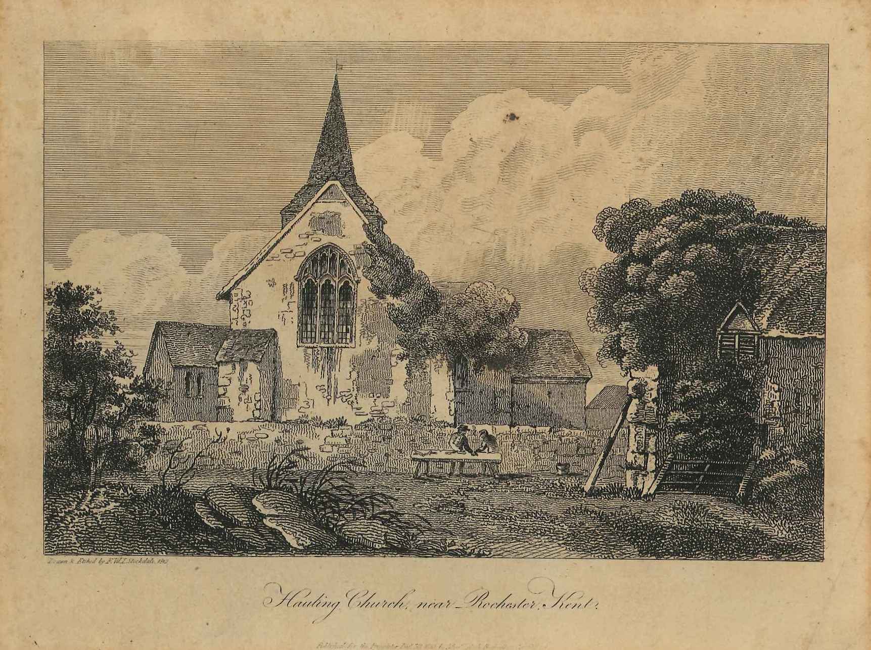 - DescriptionPrint of a view of Halling church; in the foreground are some of the overgrown ruins of Halling palace & 2 workmen with a bench; presumably taken from a book. Donated some time late 19th or early 20th century.