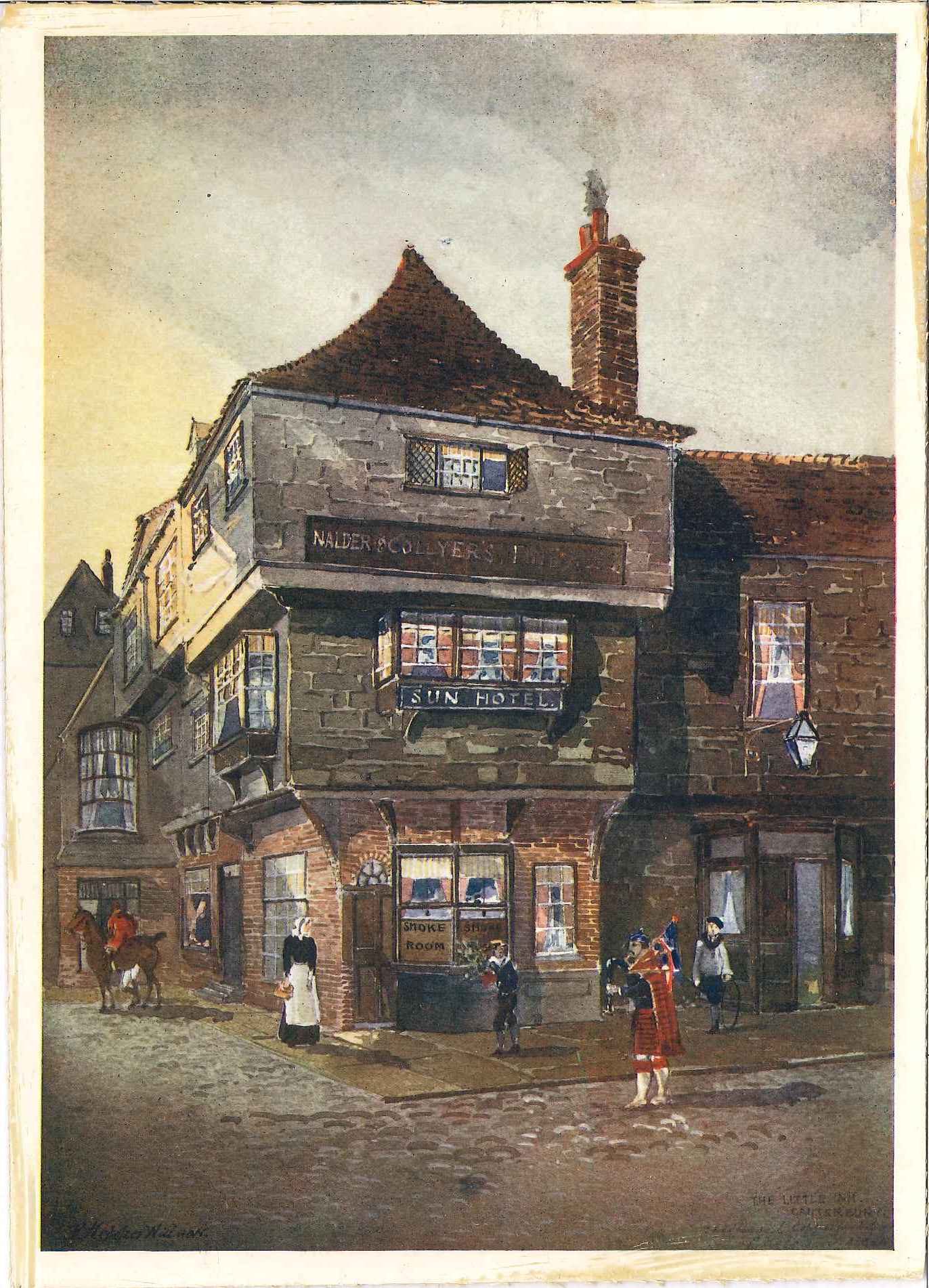- DescriptionLithographic print of a watercolour painting; depicts a scene relating to 'David Copperfield' by Charles Dickens; shows an accurate image of the 'Sun Hotel' in Canterbury used by Dickens as the 'Little Inn'. Backed on to card. See also A5001 by the same artist.