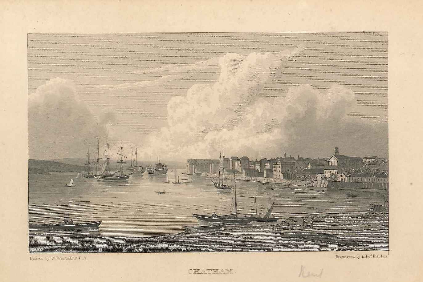 - DescriptionEngraved print; view of Chatham and the Medway foreshore from the south; various sized vessels present, dockyard beyond. Backed on to card. Taken from a book.