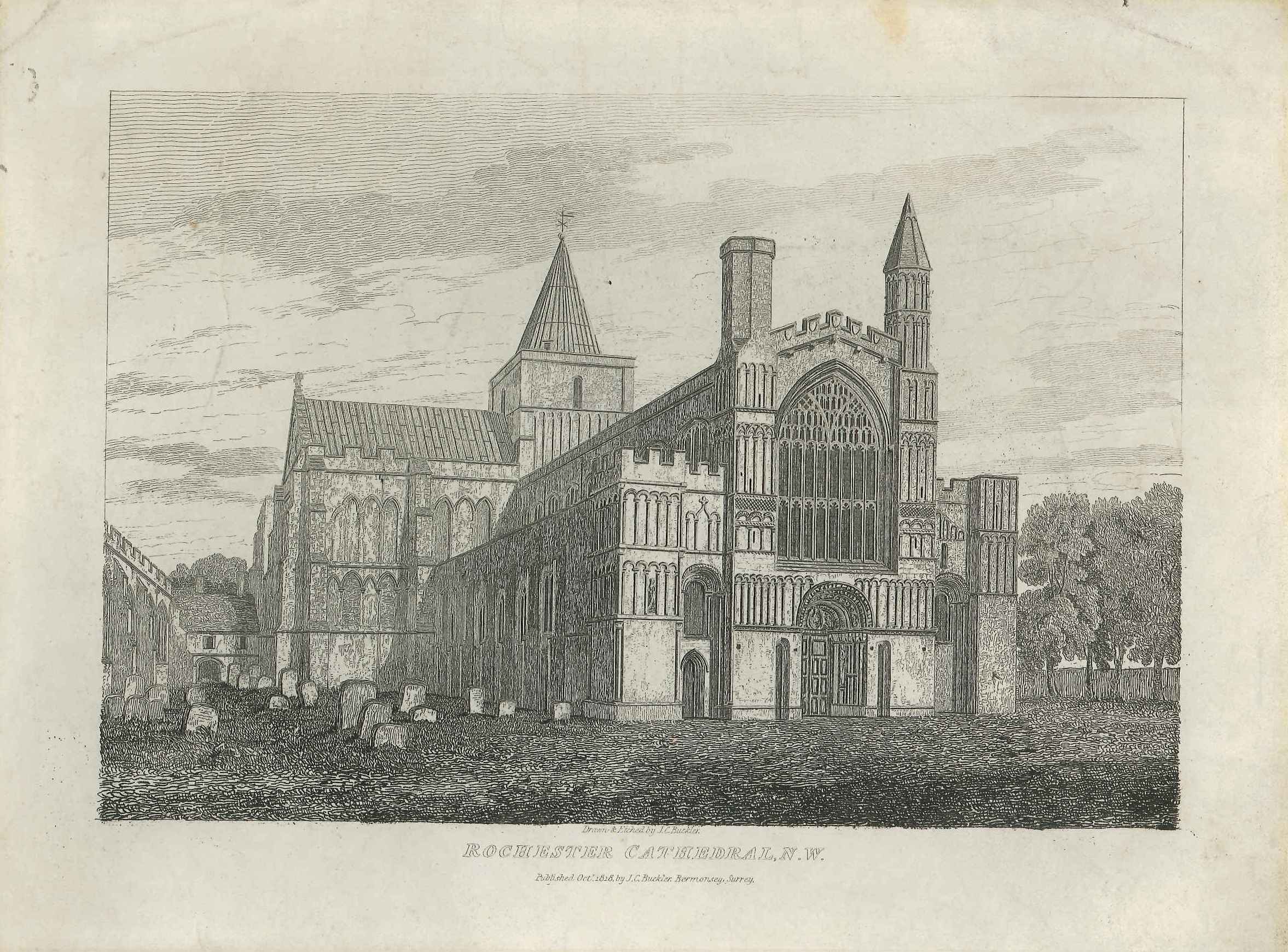 Engraving; a NW view of Rochester cathedral in 1818. Mounted on to card.