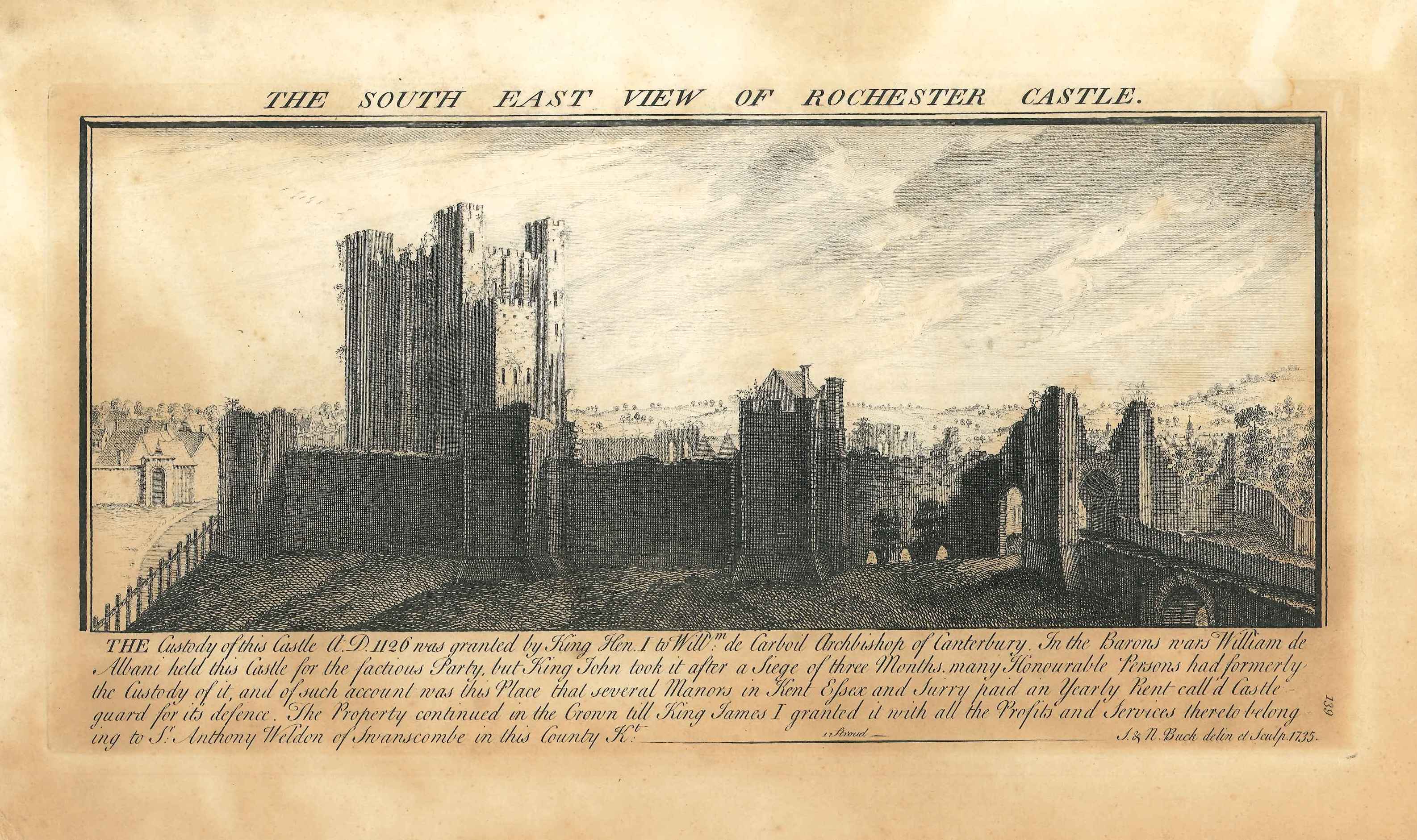 - DescriptionEngraving of a south-east view of Rochester castle in 1735; shows keep, curtain wall & original entrance; produced for Buck's 'Views of Ruins of Castles & Abbeys in England' (1726-1739). Some light browning, mounted on card.