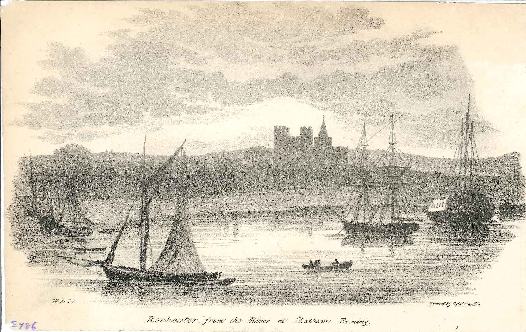 - DescriptionPrint of a view of the River Medway with Rochester castle & cathedral silhouetted in the background; fishing boat & larger sailing vessels on the River; taken from a book (plate.12) Produced for 'Sketches of the Picturesque in Rochester and its Vicinity', published by Dadson in 1825.