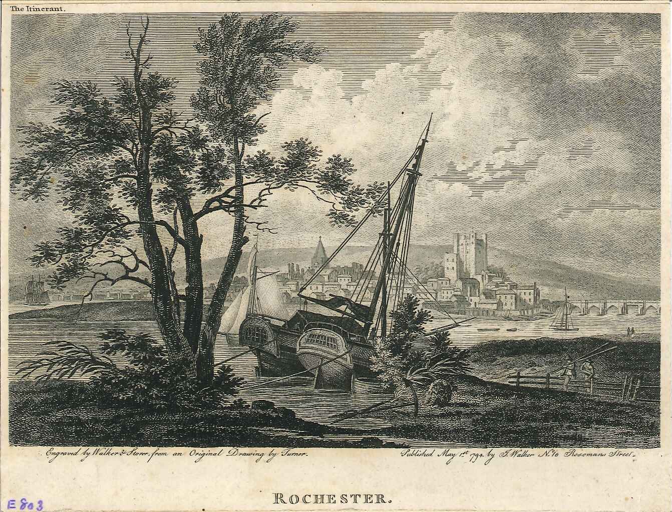 Print of a view of the River Medway and Rochester, from the Frindsbury foreshore; shows 2 moored vessels; from an original drawing by Turner; distant view of Rochester in the background across the River; taken from the book 'The Itinerant', 1794. Taken from the book: 'The Itinerant: A Select Collection of interesting and picturesque views, in Great Britain and Ireland', published in 1794 by Joshua Walker, 10 Rosoman's St, Clerkenwell.