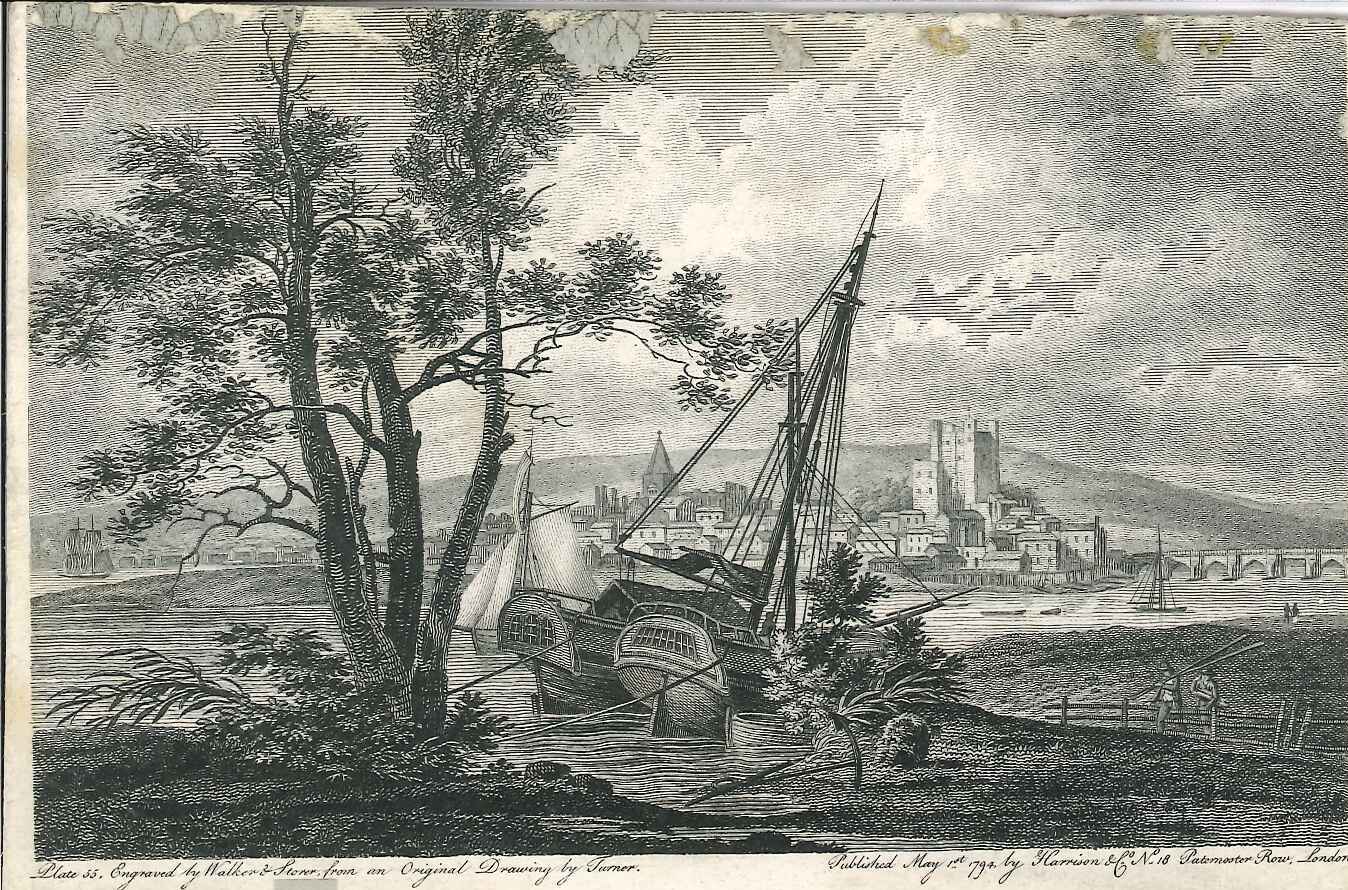 Print of a view of the River Medway and Rochester, from the Frindsbury foreshore; shows 2 moored vessels; from an original drawing by Turner; distant view of Rochester in the background across the River; taken from the book 'The Itinerant', 1794. Mounted on card, some glue around edge from previous mounting. Taken from the book: 'The Itinerant: A Select Collection of interesting and picturesque views, in Great Britain and Ireland', published in 1794 by Joshua Walker, 10 Rosoman's St, Clerkenwell.