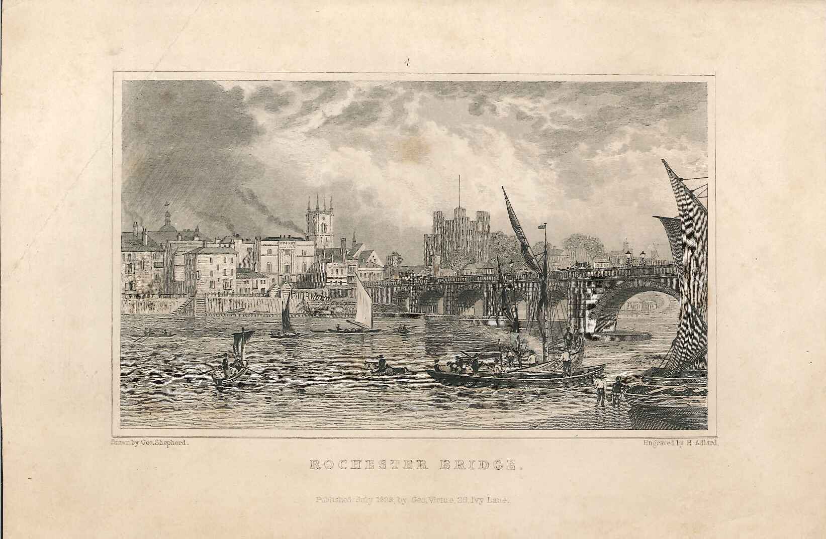 - DescriptionPrint of a view of Rochester bridge with the castle keep & cathedral beyond, from the Strood foreshore; various rowing & sailing vessels, horseman in the shallows; presumably taken from a book. Originally produced for the "England's Topographer" series of Kent views (London 1828-1831).