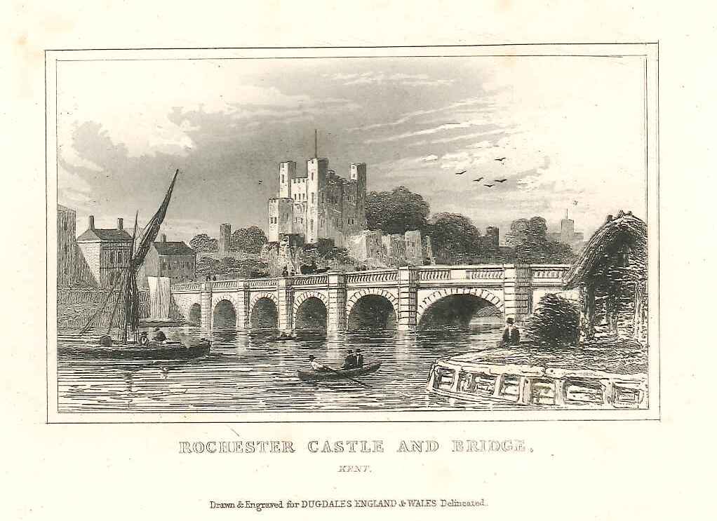 Print of a view of Rochester bridge with the castle keep beyond, from the Strood foreshore (with small ruined timber building); various rowing & sailing vessels; taken from a book. Published in 'Curiosities of Great Britain. England and Wales Delineated. Historical, Entertaining & Commercial. Alphabetically arranged. By Thomas Dugdale, Antiquarian'; a series of volumes published over the period 1835-55.
