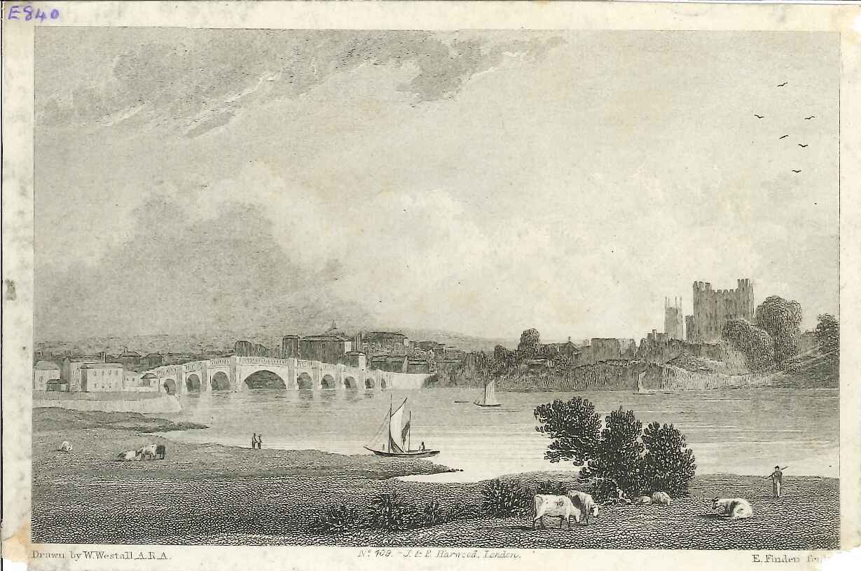 - DescriptionPrint of a view of the River Medway at Rochester; shows bridge, castle & cathedral, and part of Strood; viewed from Temple marshes; cattle in the foreground.