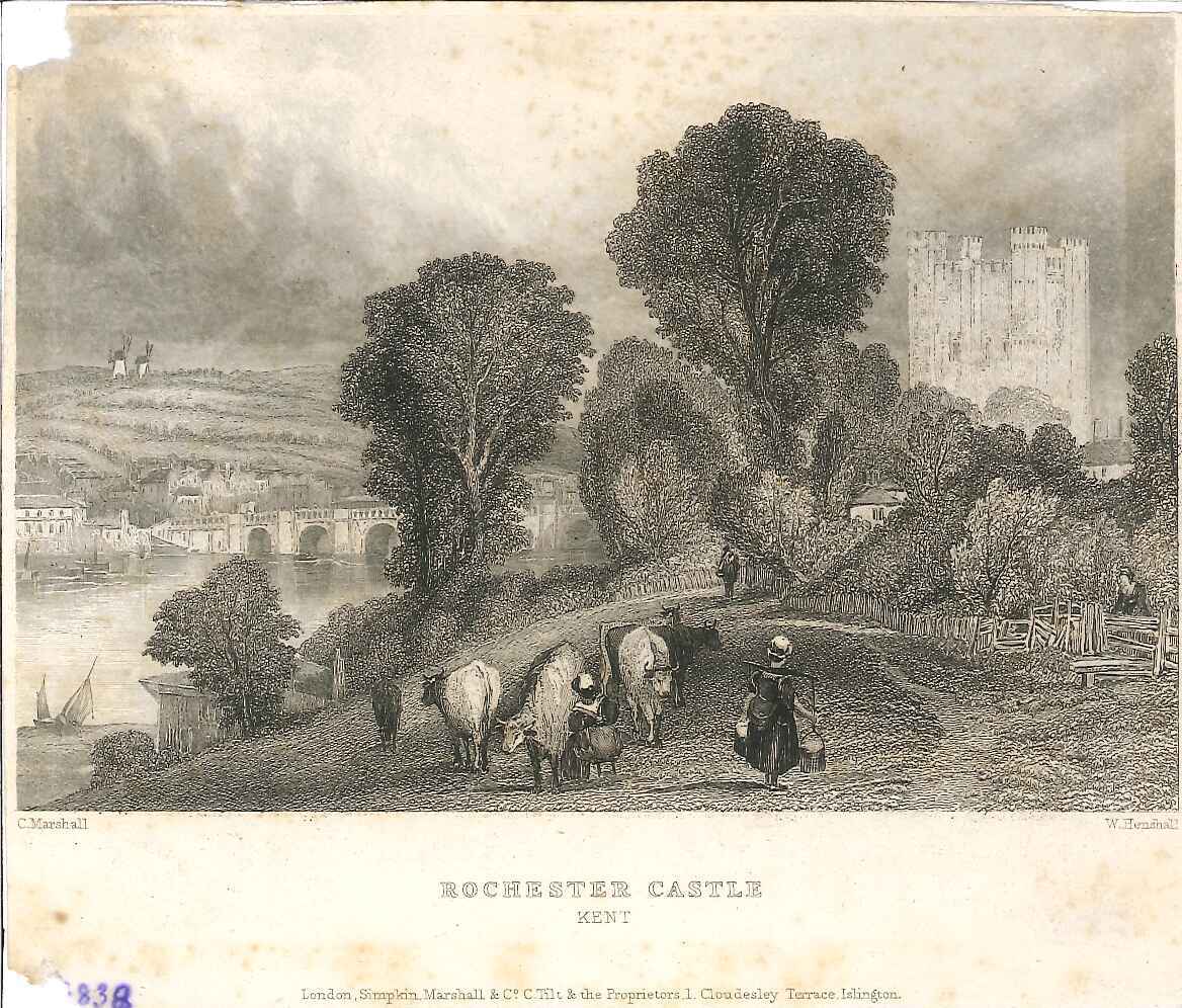 - DescriptionEngraved print of Rochester castle; based on a picture by C Marshall, engraved by W Henshall; shows castle from the south, bridge & Strood in the background, 2 windmills on the horizon; foreground has cows & milkmaids. Corners are damaged, and foxing over the sky area.