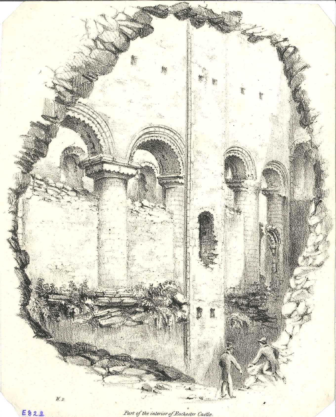 - DescriptionLithographic print of Rochester castle keep interior; shows Norman 'dogtooth' arches, 2 figures in the foreground. Produced for 'Sketches of the Picturesque in Rochester and its Vicinity', published by Dadson in 1825.