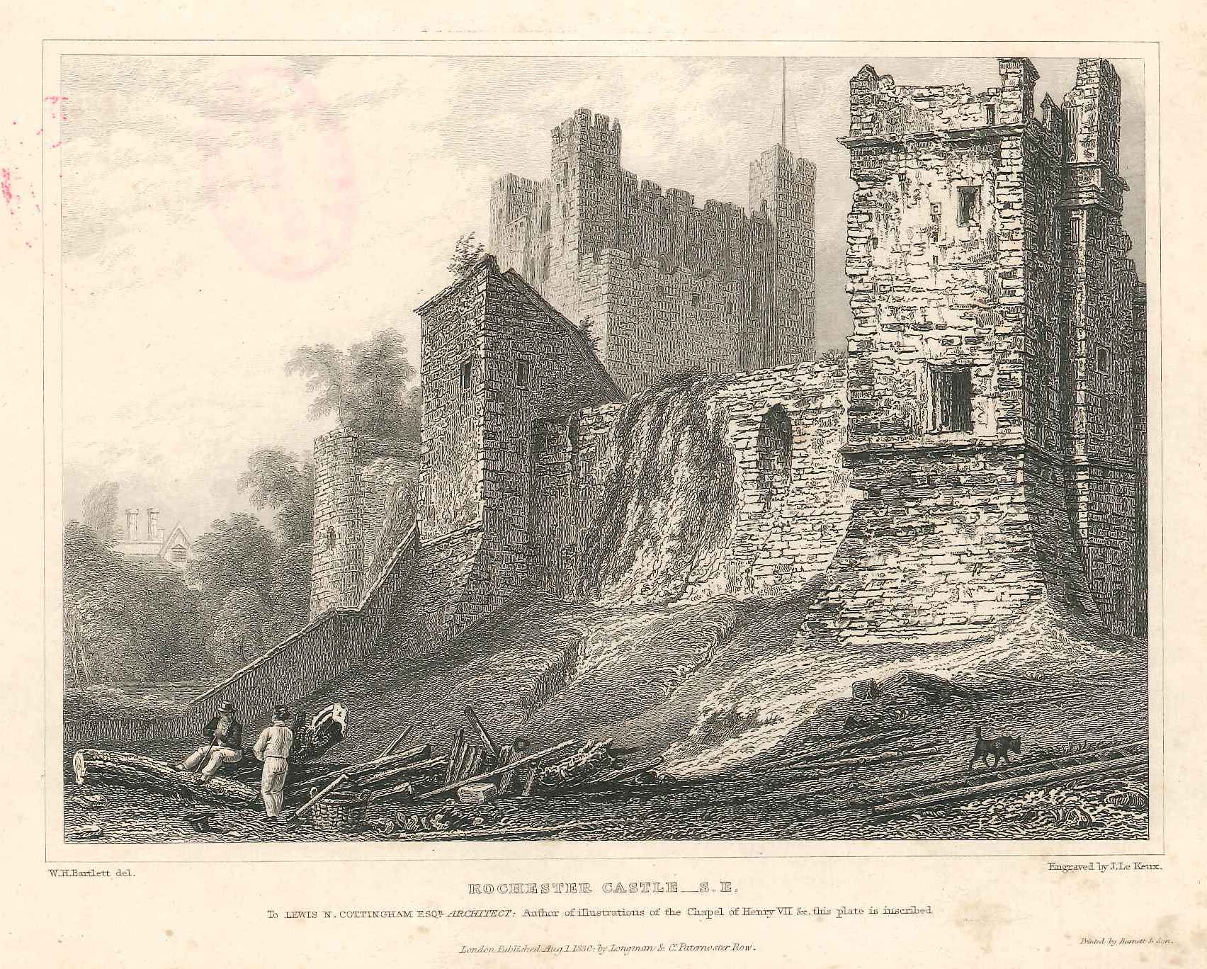 - DescriptionPrint of a view of Rochester castle seen from the north-east; close view of the moat, with wood being worked, seated figures, etc. Some foxing and wear on one edge. Although this print is entitled 'Rochester Castle S E', it is actually a view from the north-east, looking south-west!