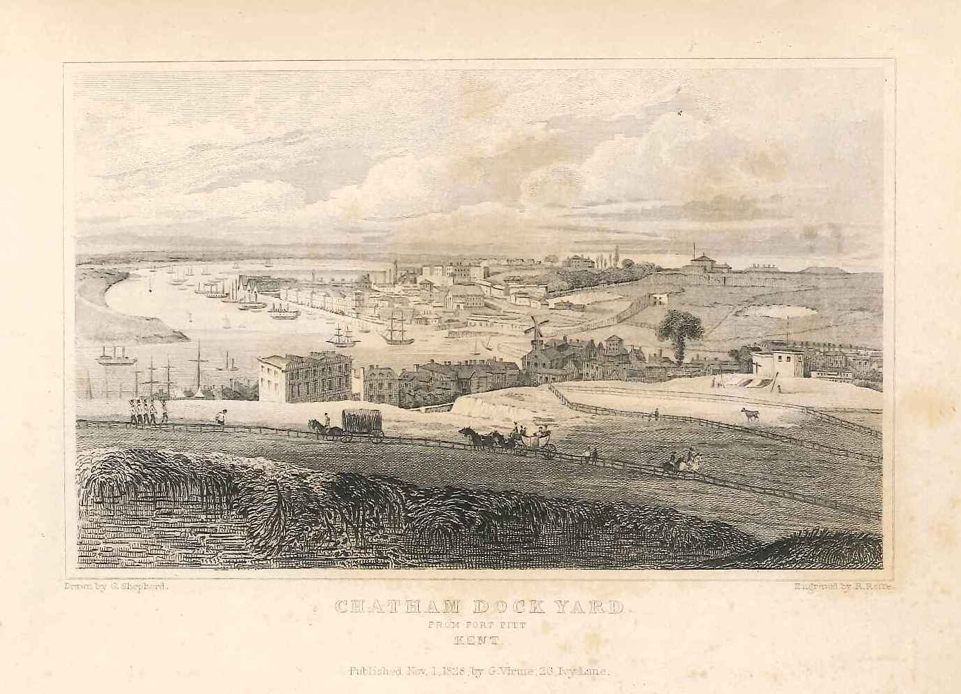 - DescriptionPrint of a view of Chatham dockyard viewed from Fort Pitt; taken from a book. Some foxing and fraying at the edges. Originally produced for the "England's Topographer" series of Kent views (London 1828-1831).