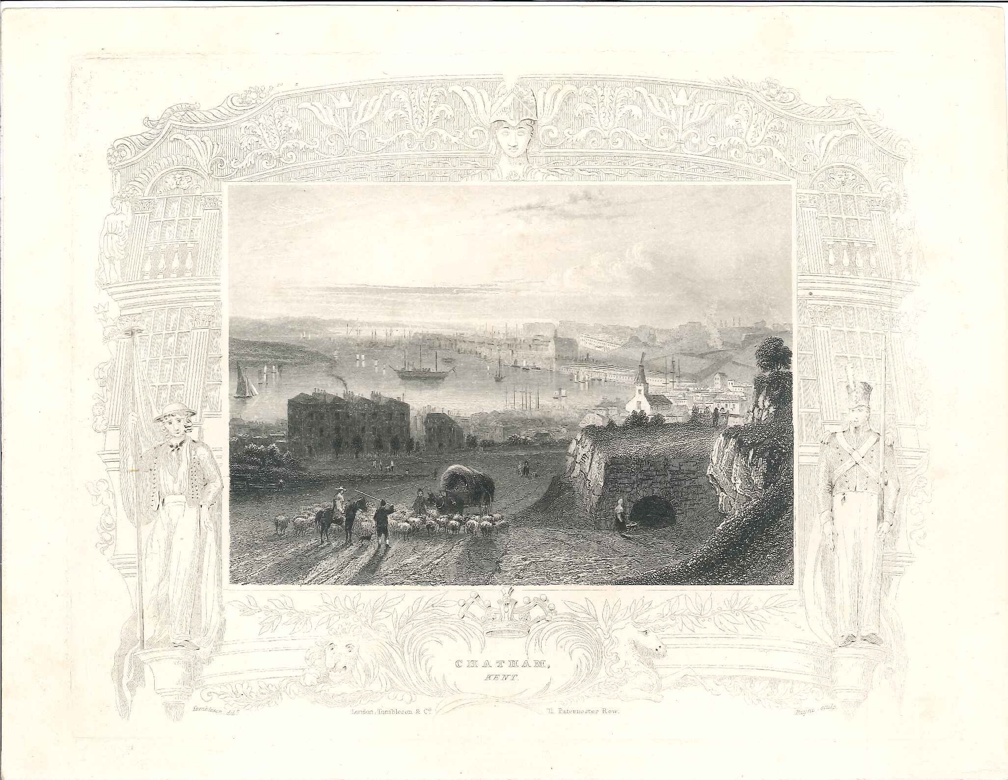 - DescriptionPrint of a view of Chatham, the Medway beyond; in the foreground are sheep & rustic folk, a tunnel entrance; from 'Views of the Thames & Medway' (1833-34); decorative printed border. Taken from Tombleson's 'Views of the Thames & Medway', a part-work published 1833-1834.