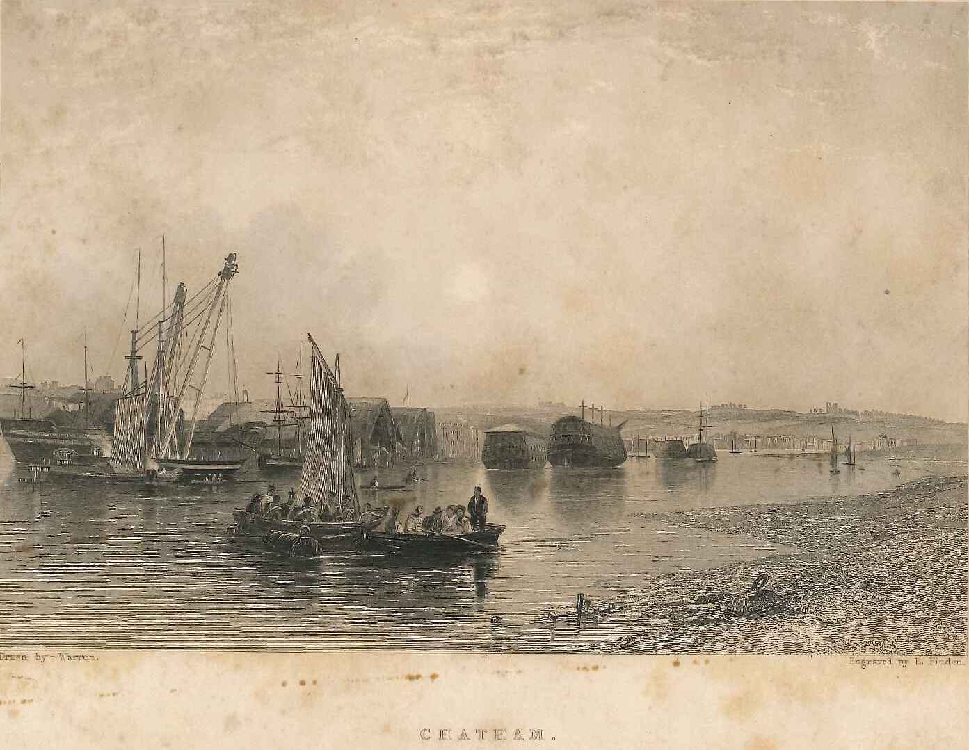 - DescriptionPrint of a view of the River Medway at Chatham; shows two rowing boats with sailors & civilians, various Navy vessels & sheds beyond. Light overall foxing. Pencil note on reverse, "from Findens Views continued(?) by W H Bartlett revised & Ed by W Beattie MD(?) in quarterly parts price 11s London Geo Virtue & Co 1839''