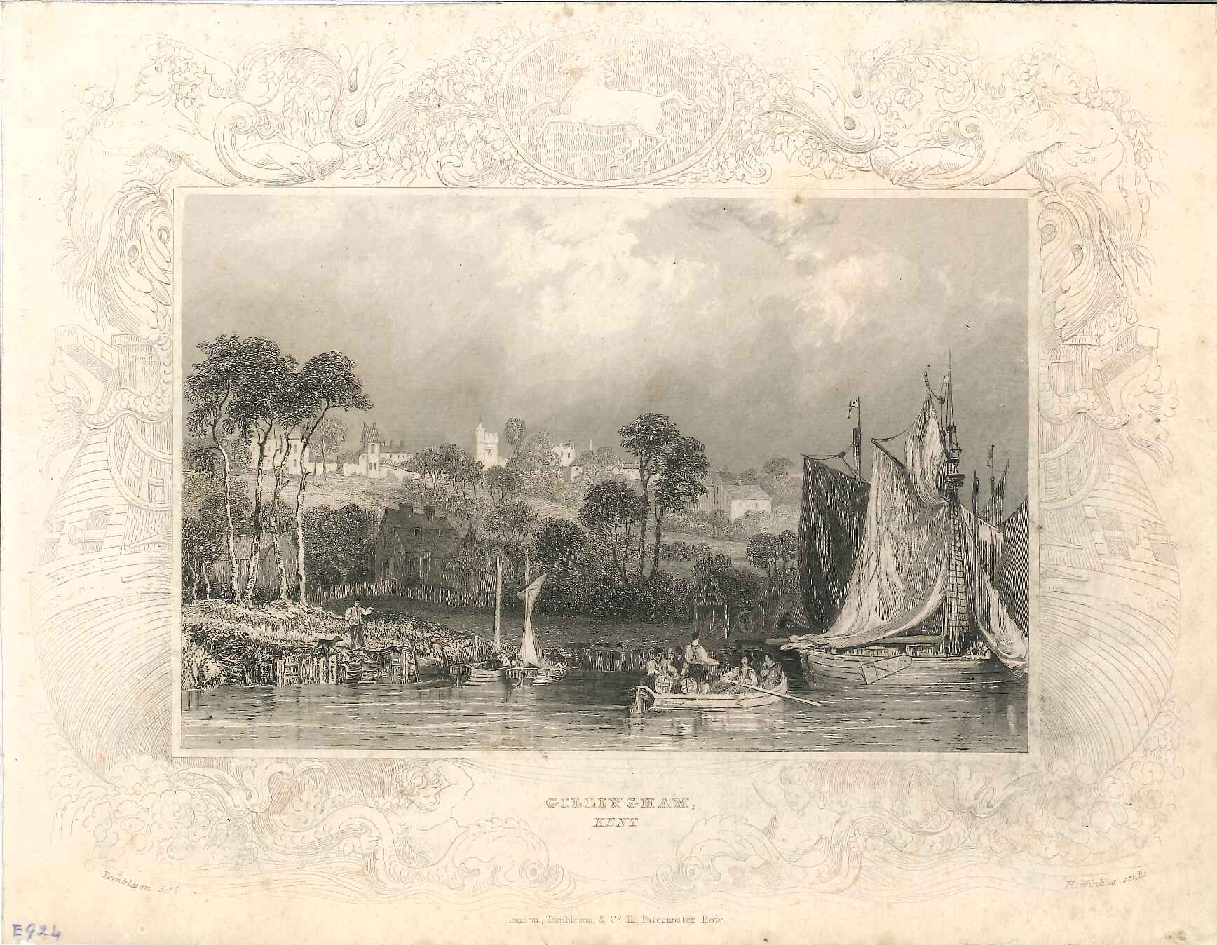 - DescriptionEngraved print of the River Medway at Gillingham; shows small sailing vessels being unloaded, rowing boats; up the slope you can see Gillingham old church & other buildings; decorative border; light staining/ foxing. Taken from Tombleson's 'Views of the Thames & Medway', a part-work originally published 1833-1834.