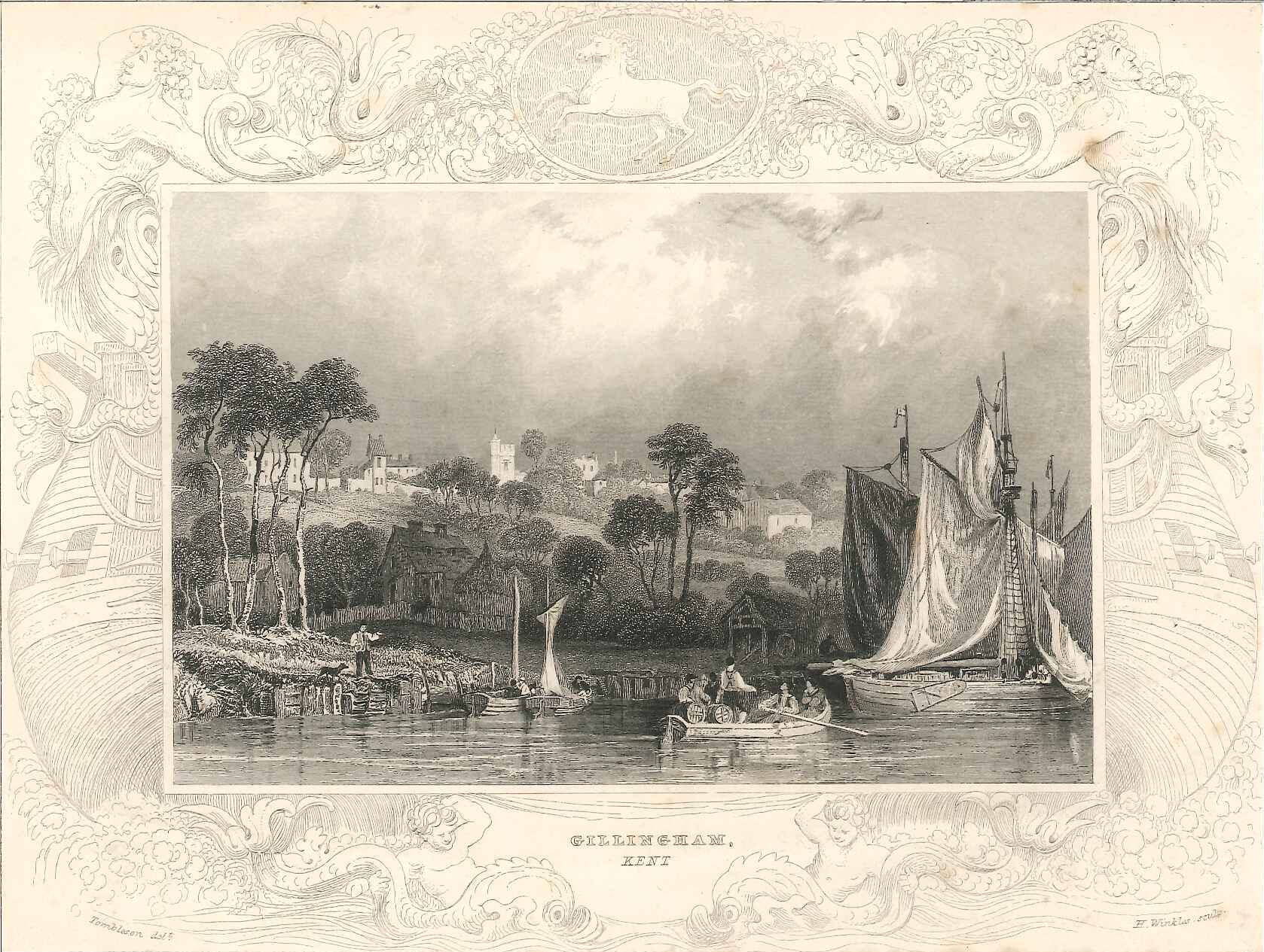 - DescriptionEngraved print of the River Medway at Gillingham; shows small sailing vessels being unloaded, rowing boats; up the slope you can see Gillingham old church & other buildings; decorative border; light staining/ foxing. Taken from Tombleson's 'Views of the Thames & Medway', a part-work originally published 1833-1834.
