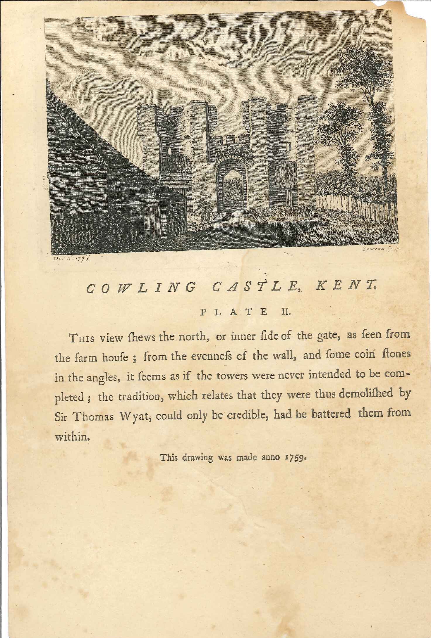 - DescriptionEngraved print of Cooling castle; shows gatehouse with towers from the inside, large building to the left; taken from a book, with accompanying history text below; this image being 'Plate II' (see A4992 for 'Plate I' from the same book). This and A5135 are removed from the same book.