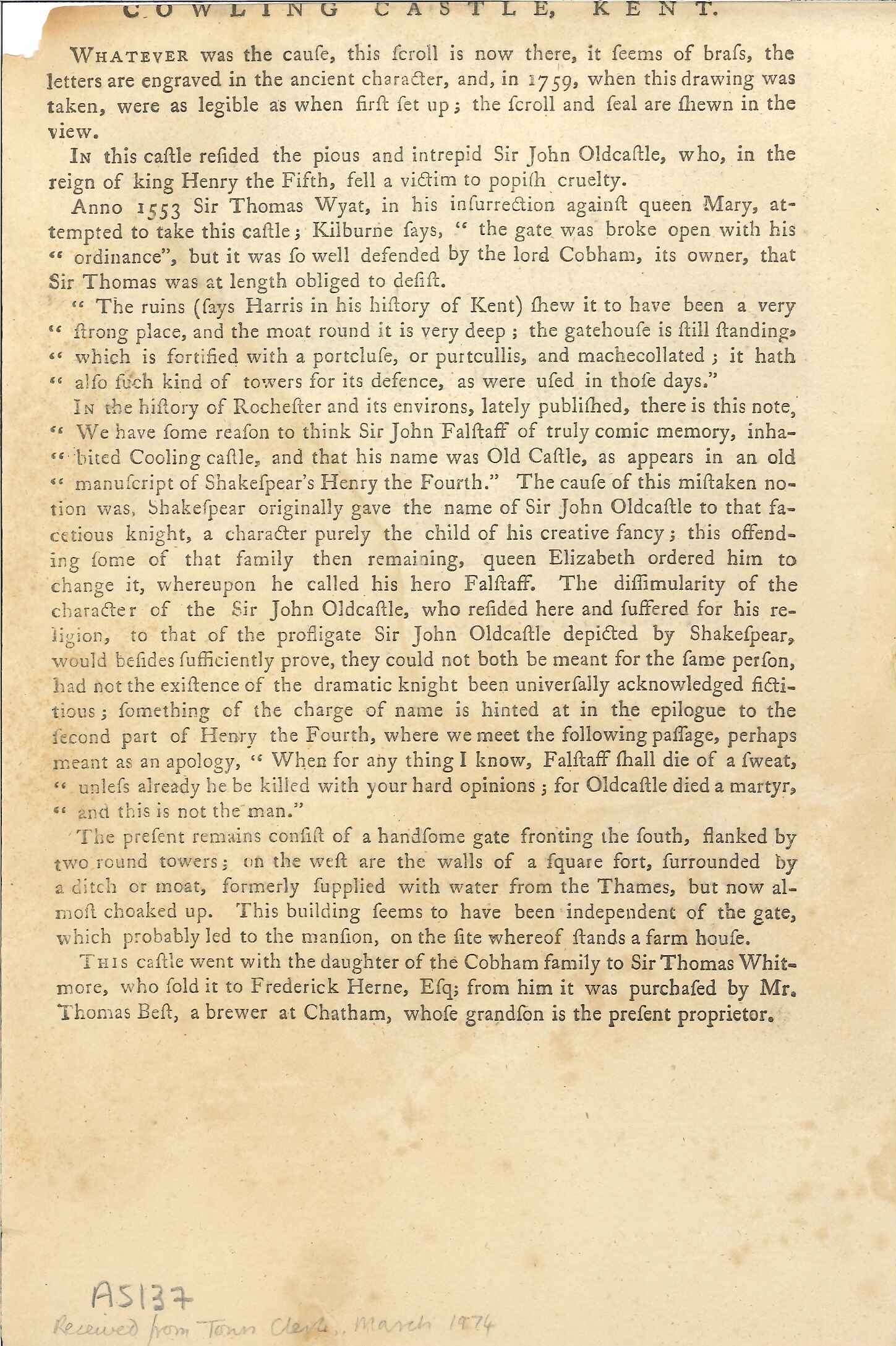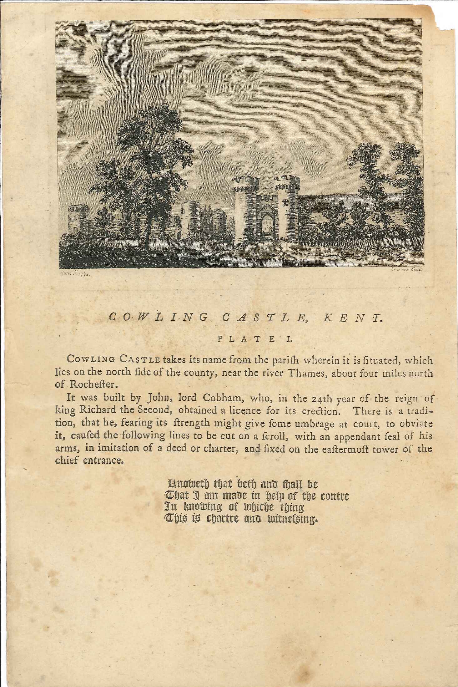 - DescriptionEngraved print of Cooling castle; shows gatehouse & part of curtain walls with towers; taken from a book, with accompanying history text below & overleaf, image being 'Plate I' (see A4993 for 'Plate II' from the same book).