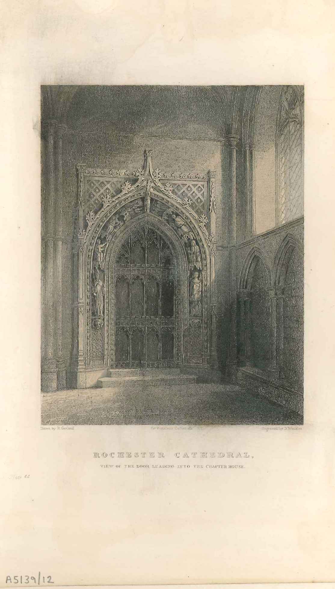 - DescriptionPrint of a detailed view of the interior doorway into the chapter house of Rochester cathedral in 1836; shows detail of ornate archway; published for the book 'Winkle's Cathedral Churches of England & Wales' (1836-38). Bound in a large volume.