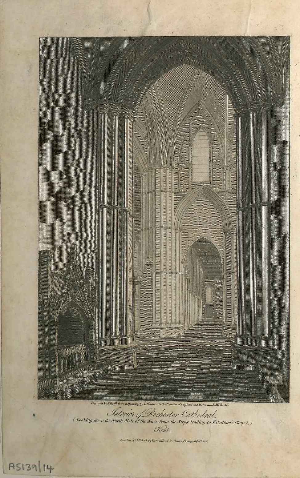 - DescriptionPrint of a detailed view of the interior of the nave of Rochester cathedral in circa 1806; published for the book 'Beauties of England & Wales'. Bound in a large volume.