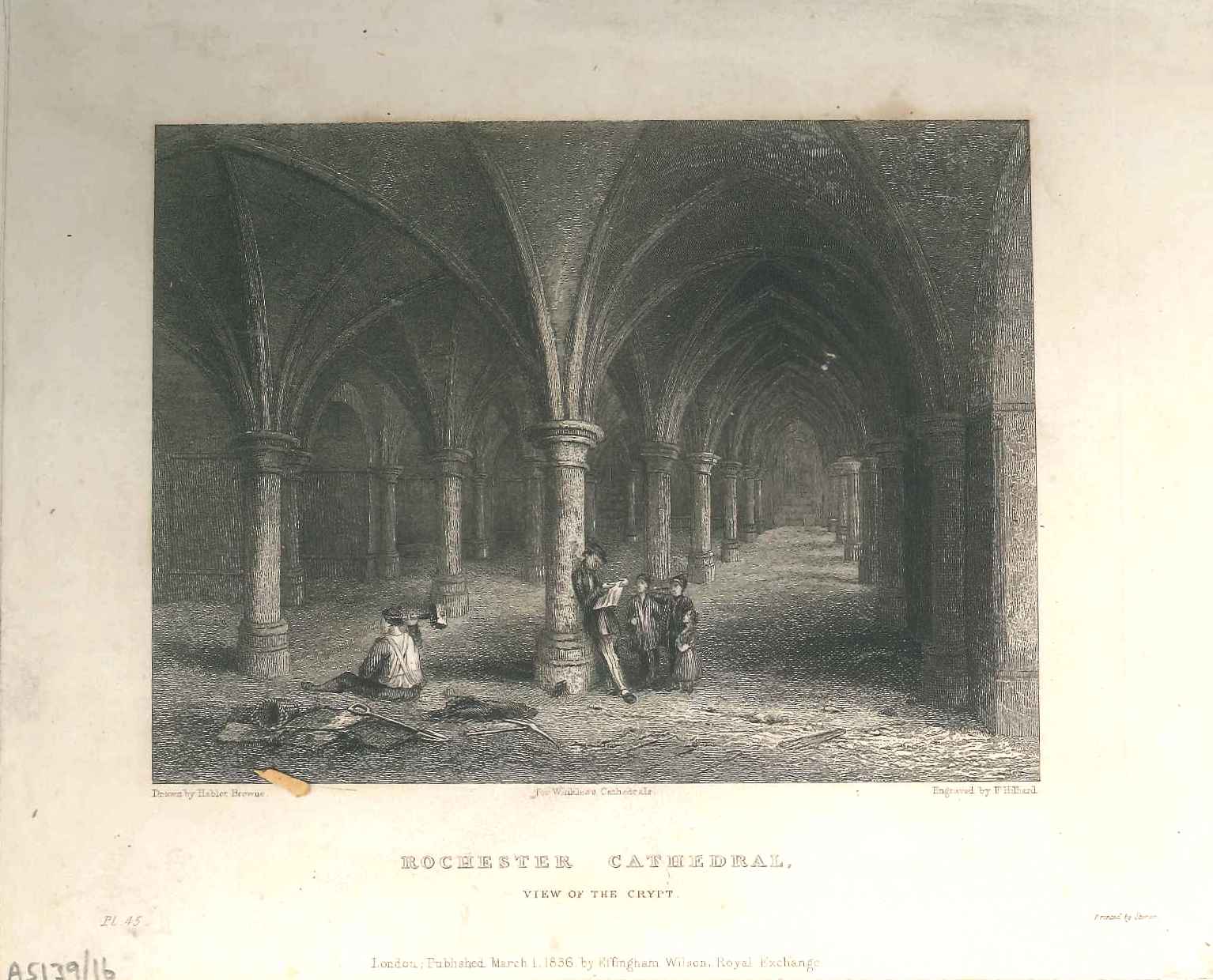 - DescriptionPrint of a detailed view of Rochester cathedral crypt in 1836; shows seated workman & man with children; published for the book 'Winkle's Cathedral Churches of England & Wales' (1836-38). Bound in a large volume.