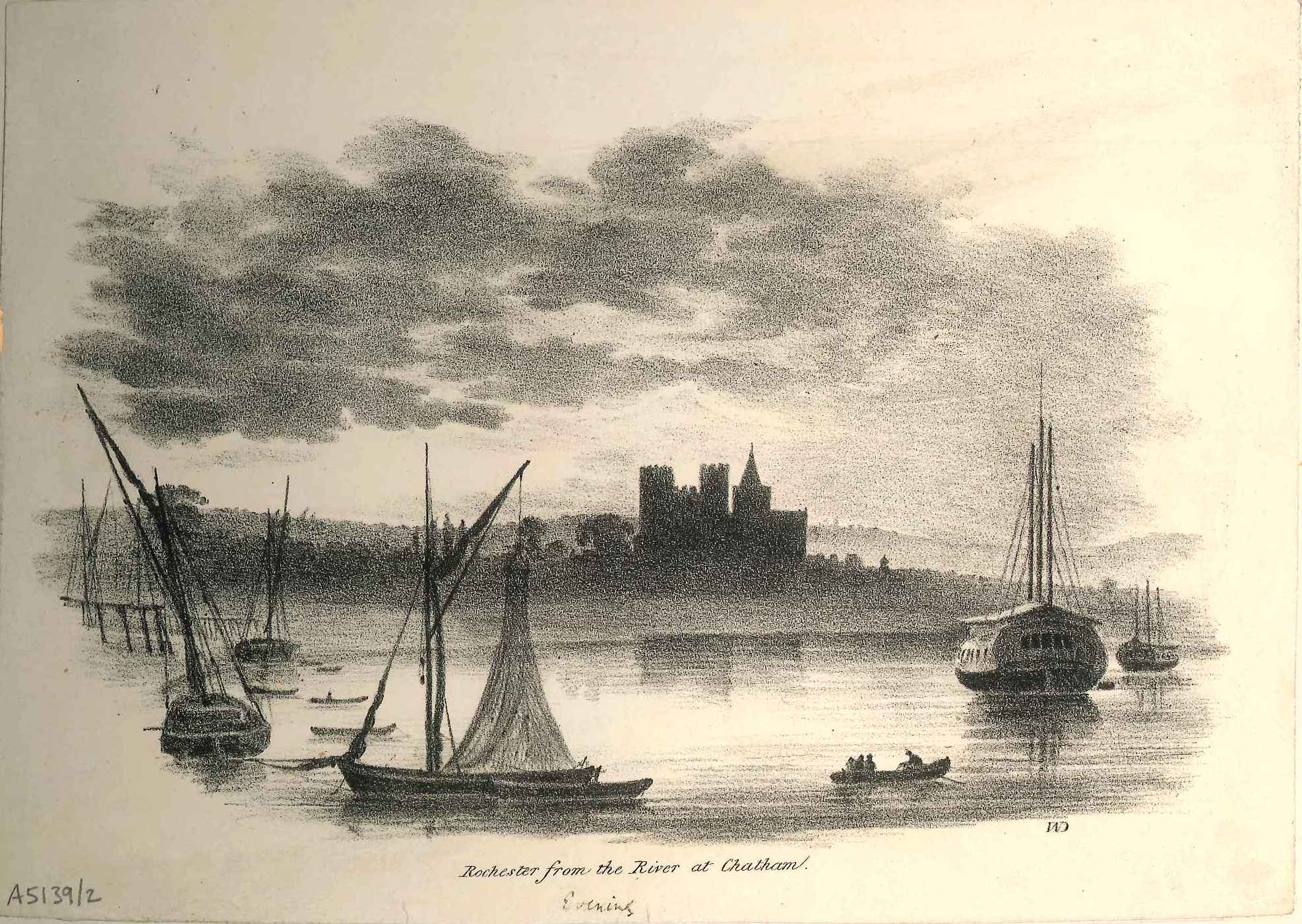 - DescriptionLithographic print of a pencil sketch of Rochester seen from Chatham at sunset; various sailing & rowing vessels in the foreground in the foreground, castle & cathedral seen in silhouette on the horizon. Bound in a large volume. Produced for 'Sketches of the Picturesque in Rochester and its Vicinity', published by Dadson in 1825.