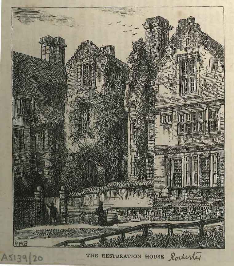 - DescriptionPrint of a view of Restoration House, Rochester, in circa 1875; cut out of a magazine or journal (probably 'The Builder') - text on the reverse. Bound in a large volume.