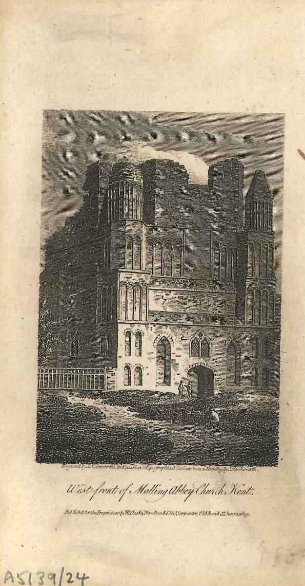 - DescriptionPrint of a view of Malling Abbey church ruins in circa 1809; produced for the 'Antiquarian & Topographical Cabinet', published as a series of volumes 1807-1811. Bound in a large volume.