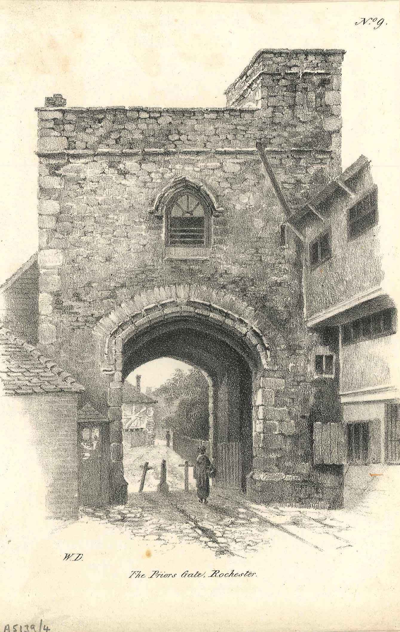 - DescriptionLithographic print of the Prior's Gate, Rochester; shows lone female figure walking through. Bound in a large volume. Produced for 'Sketches of the Picturesque in Rochester and its Vicinity', published by Dadson in 1825.