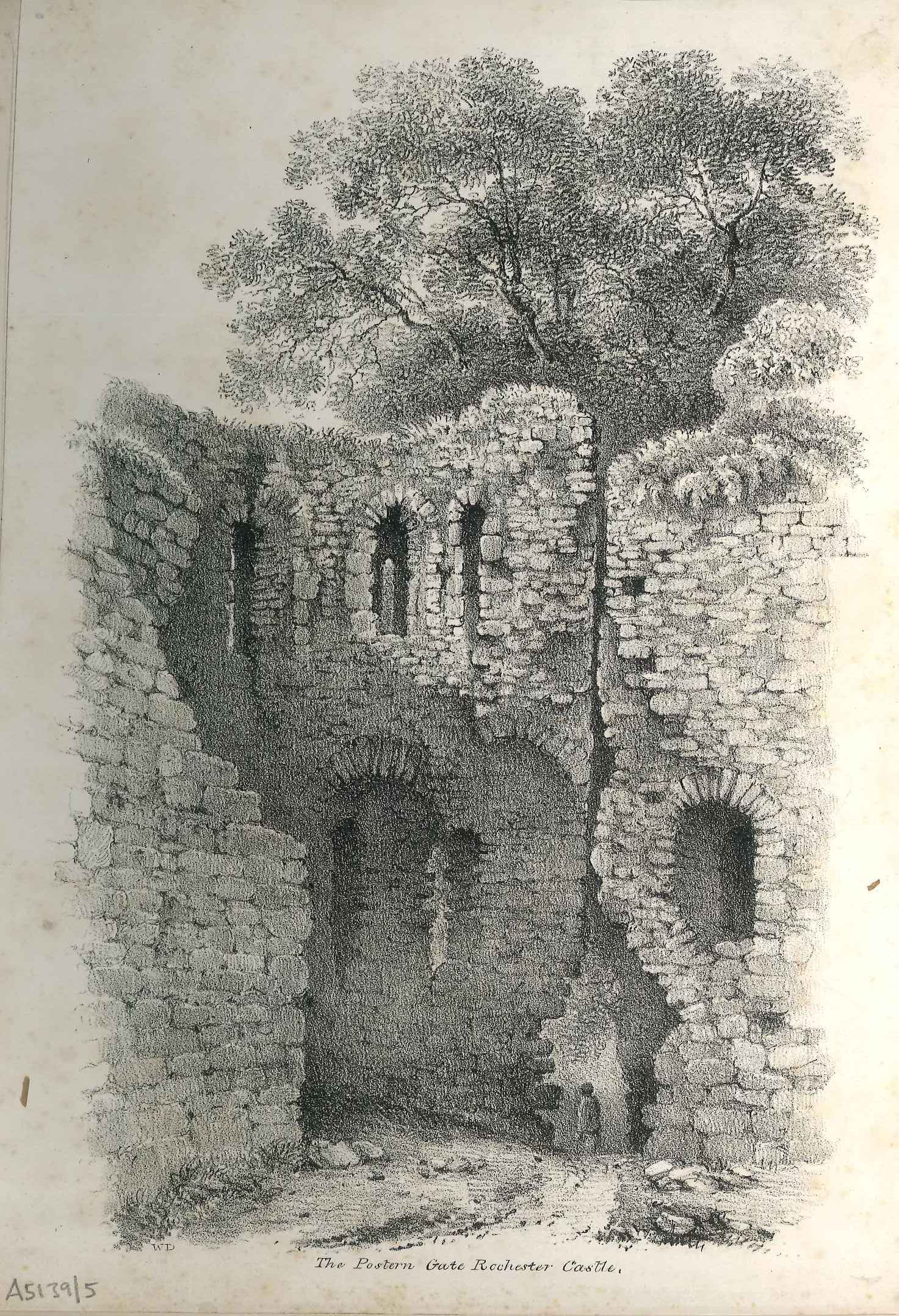 - DescriptionLithographic print of Rochester Castle postern gate, circa 1825; view shows a figure exiting via a footpath through ruins. Bound in a large volume. Probably produced for 'Sketches of the Picturesque in Rochester and its Vicinity', published by Dadson in 1825.