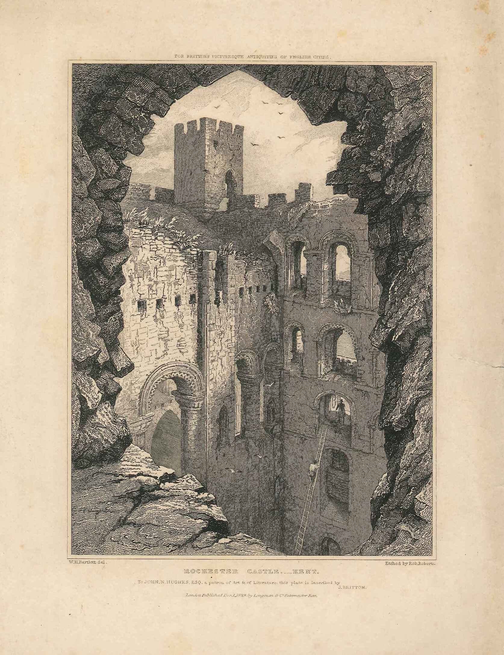 - DescriptionPrint of a view of Rochester castle keep interior showing Norman 'dogtooth' arches; 2 visitors ascending by ladder! Produced for 'Britton's Picturesque Antiquities of English Cities'.