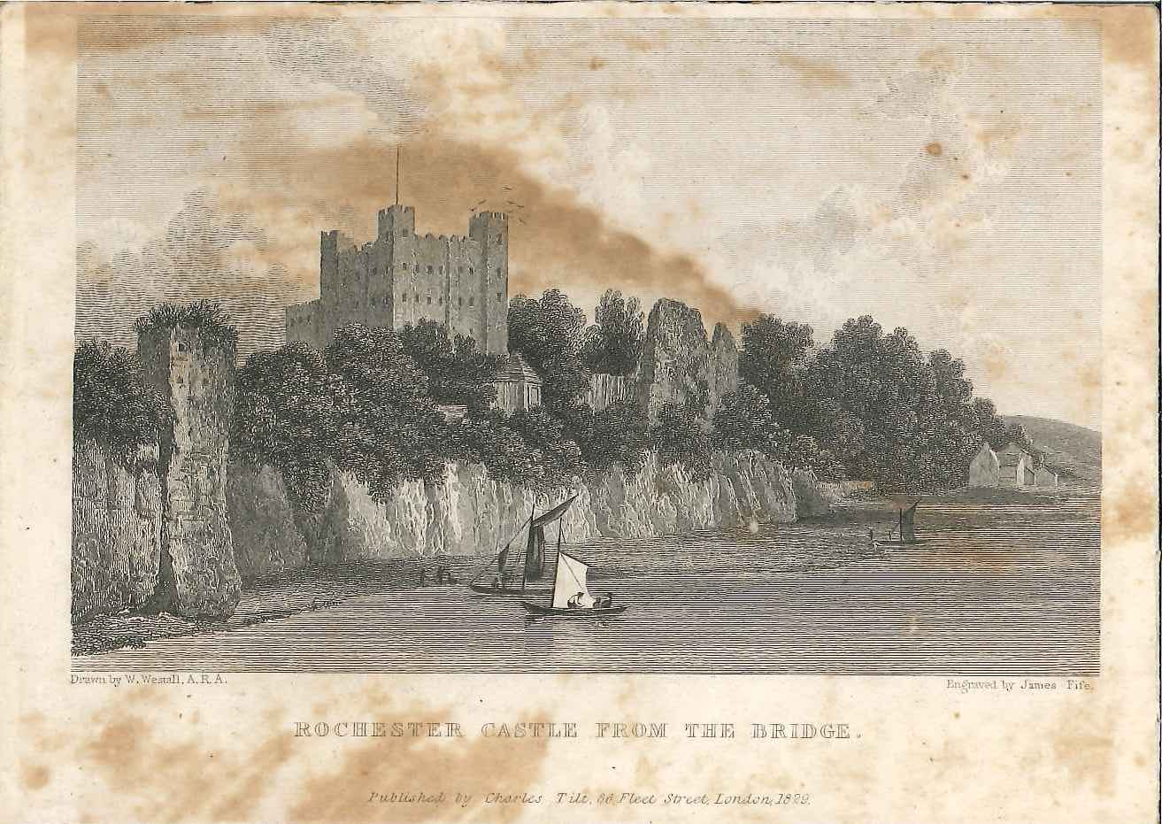 - DescriptionPrint of a view of Rochester castle seen from the bridge; shows chalk cliffs instead of later esplanade; several small fishing boats on the river, quite bad foxing/ brown staining; produced for a book. Acquired some time early in the museum's history, probably pre-1905. Mounted on card.
