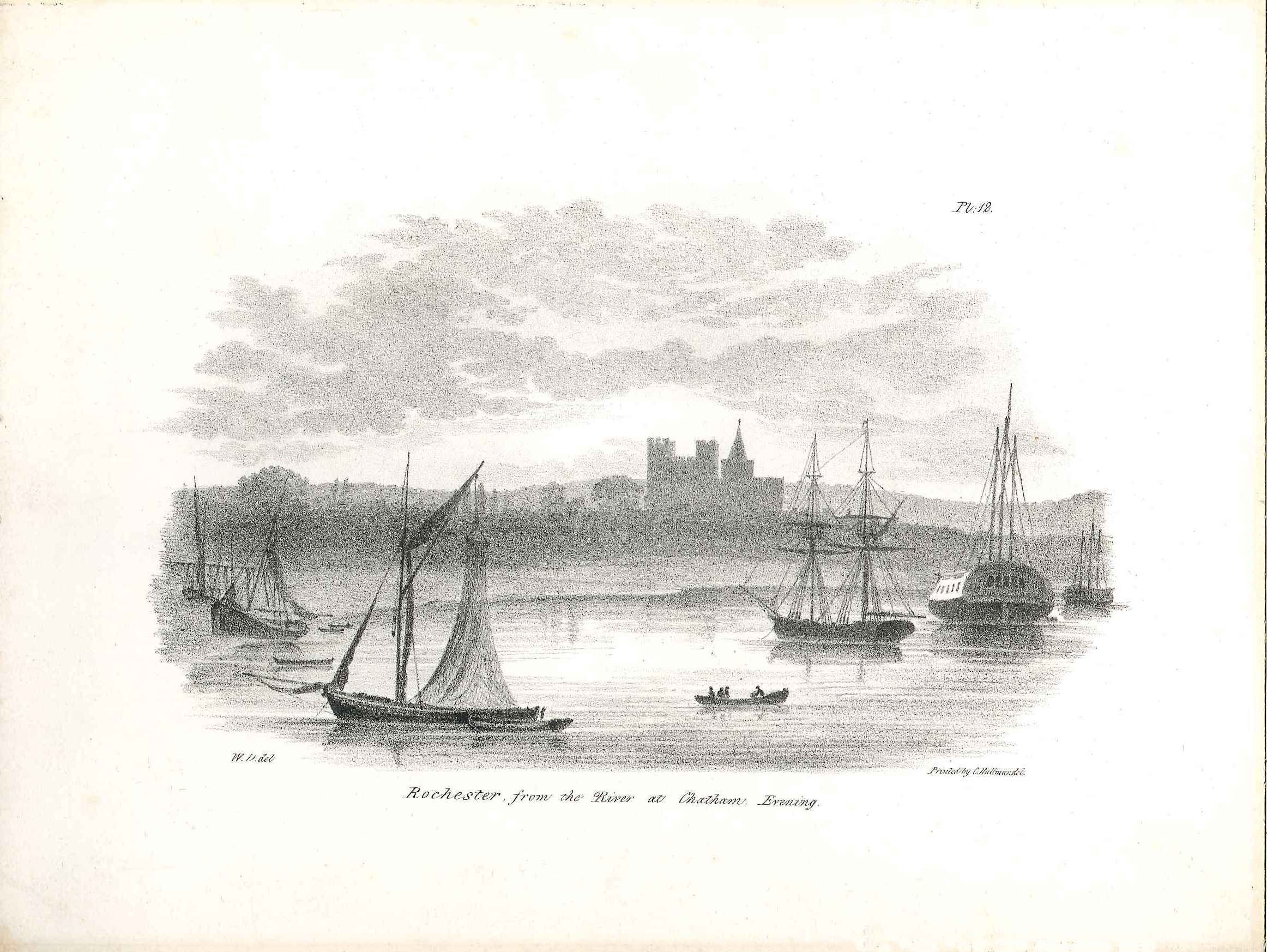 - DescriptionPrint of a view of the River Medway with Rochester castle & cathedral silhouetted in the background; fishing boat & larger sailing vessels on the River; (plate 12). Produced for 'Sketches of the Picturesque in Rochester and its Vicinity', published by Dadson in 1825.