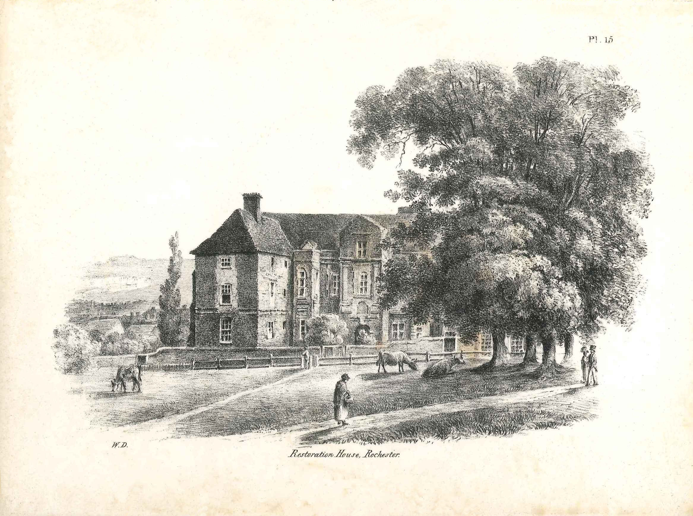 - DescriptionPrint of a view of Restoration House in Rochester; viewed from the Vines, with passing pedestrians & cattle; (plate 15). Mounted on card. Produced for 'Sketches of the Picturesque in Rochester and its Vicinity', published by Dadson in 1825.