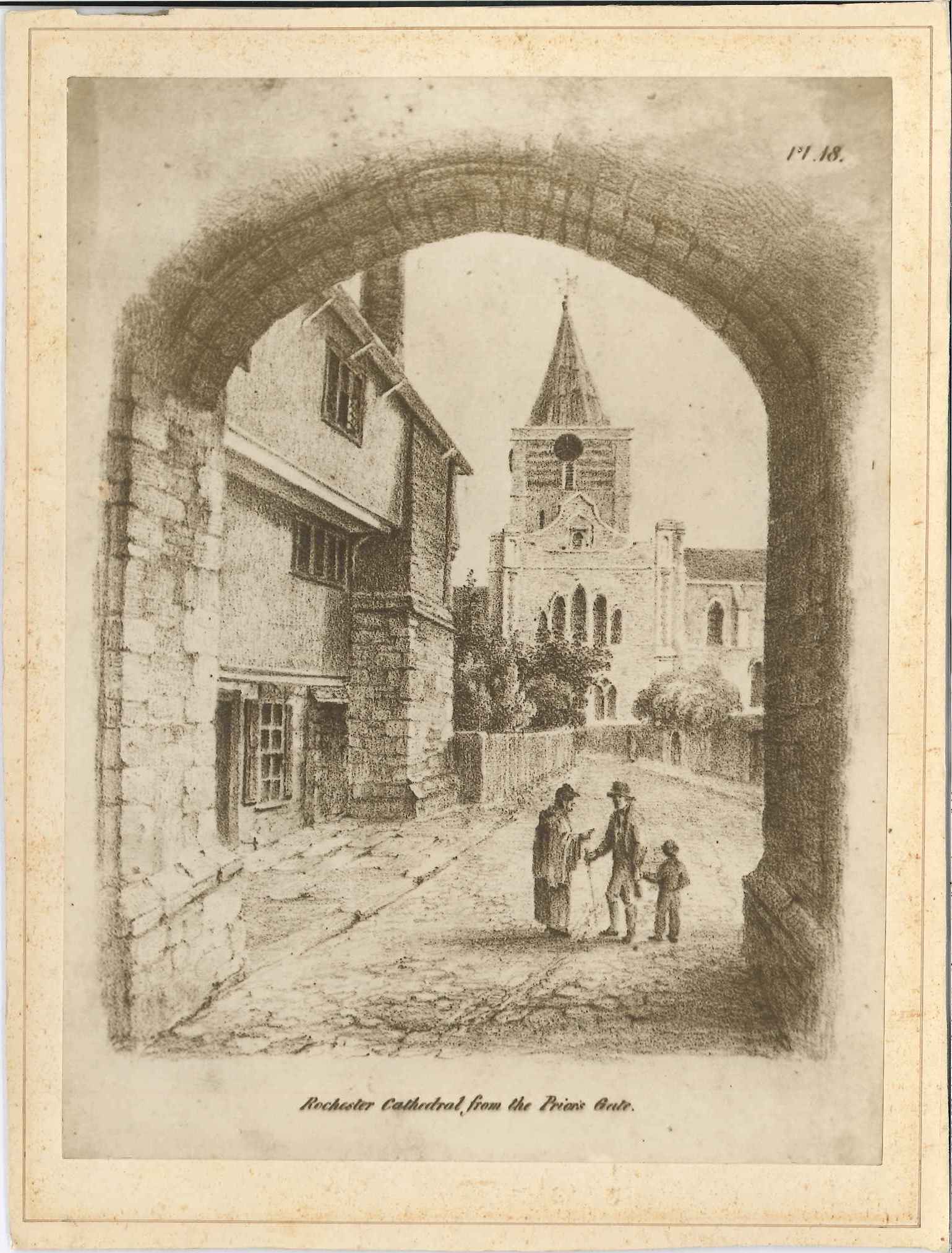 Photographic copy of a lithographic print of the Prior's Gatehouse, Rochester, looking south, old lady, man & child converse in the gateway. Mounted on card, this is a photographic copy of a print in the collection produced for Mr G E Dibley (local geologist) in February 1921. Originally produced for 'Sketches of the Picturesque in Rochester and its Vicinity', published by Dadson in 1825.