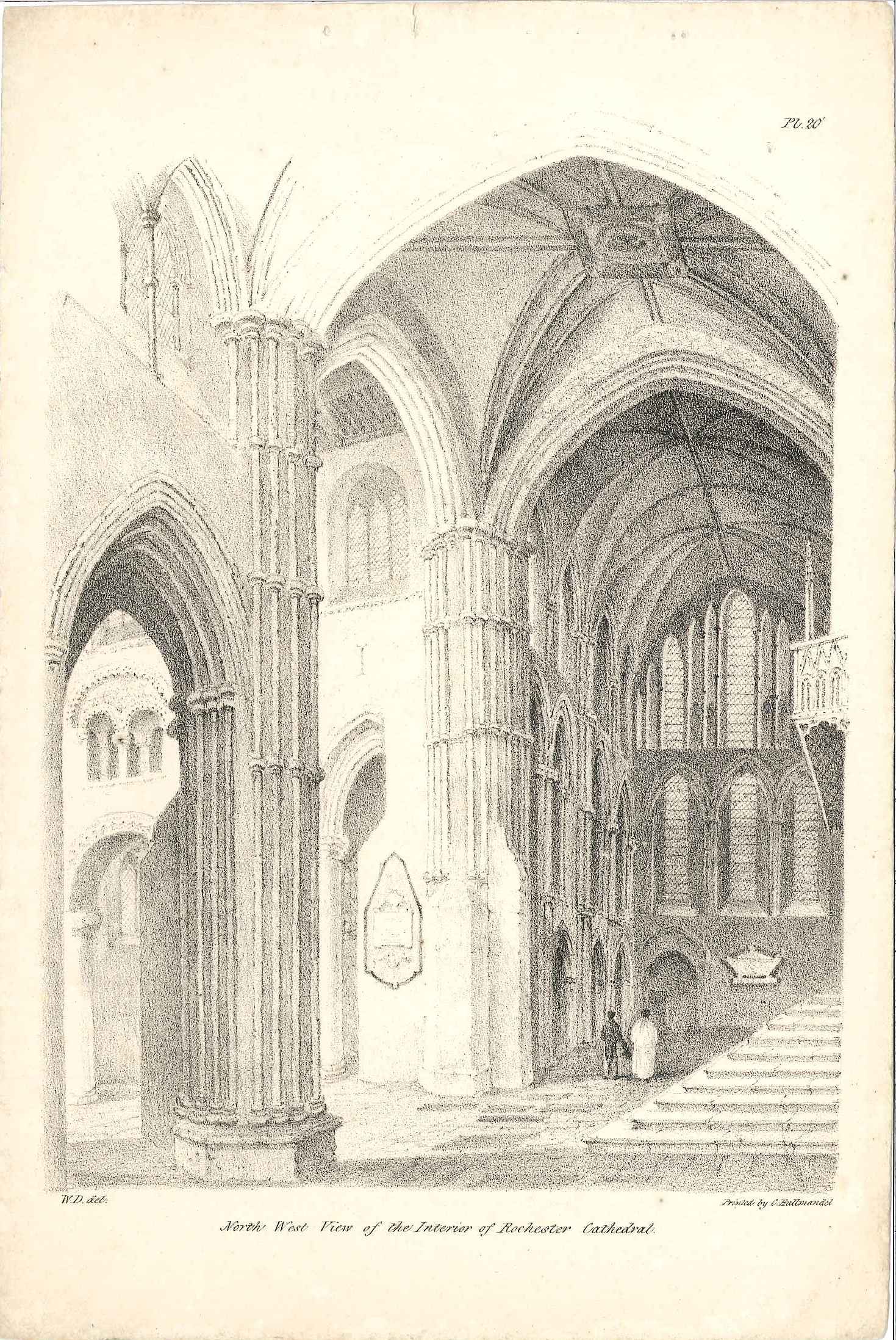 - DescriptionLithographic print of a pencil drawing of an interior north-west view of Rochester cathedral; (plate no.20). Produced for 'Sketches of the Picturesque in Rochester and its Vicinity', published by Dadson in 1825.