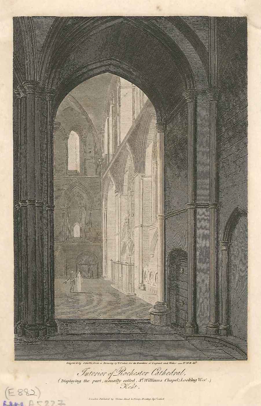 - DescriptionPrint of a detailed view of the interior of the nave of Rochester cathedral in circa 1806; published for the book 'Beauties of England & Wales'.
